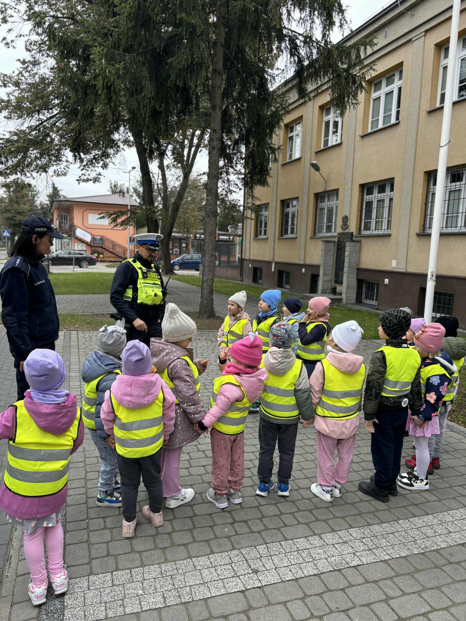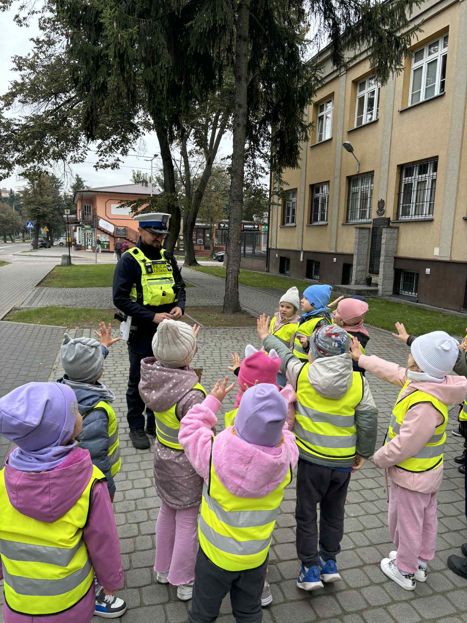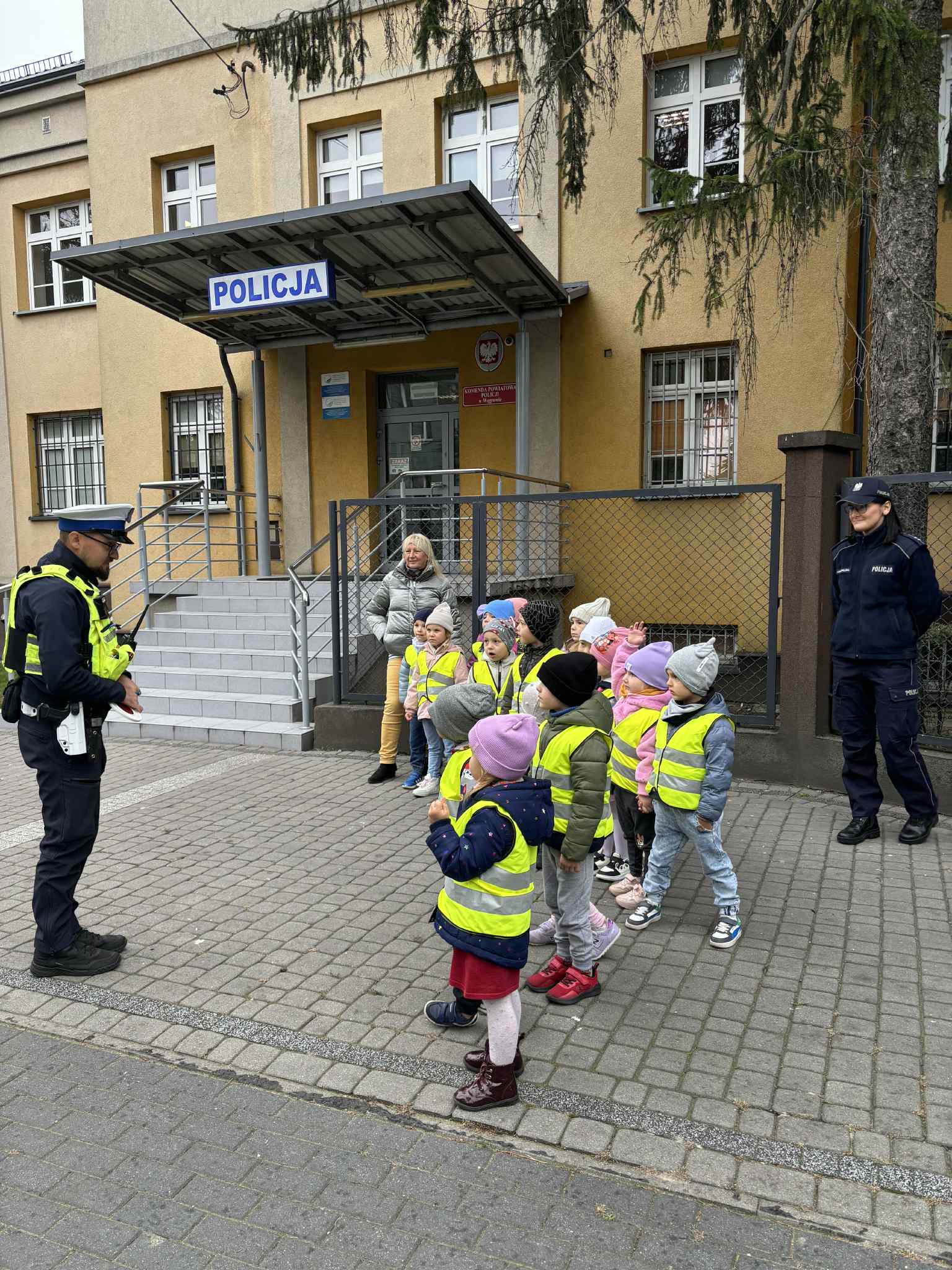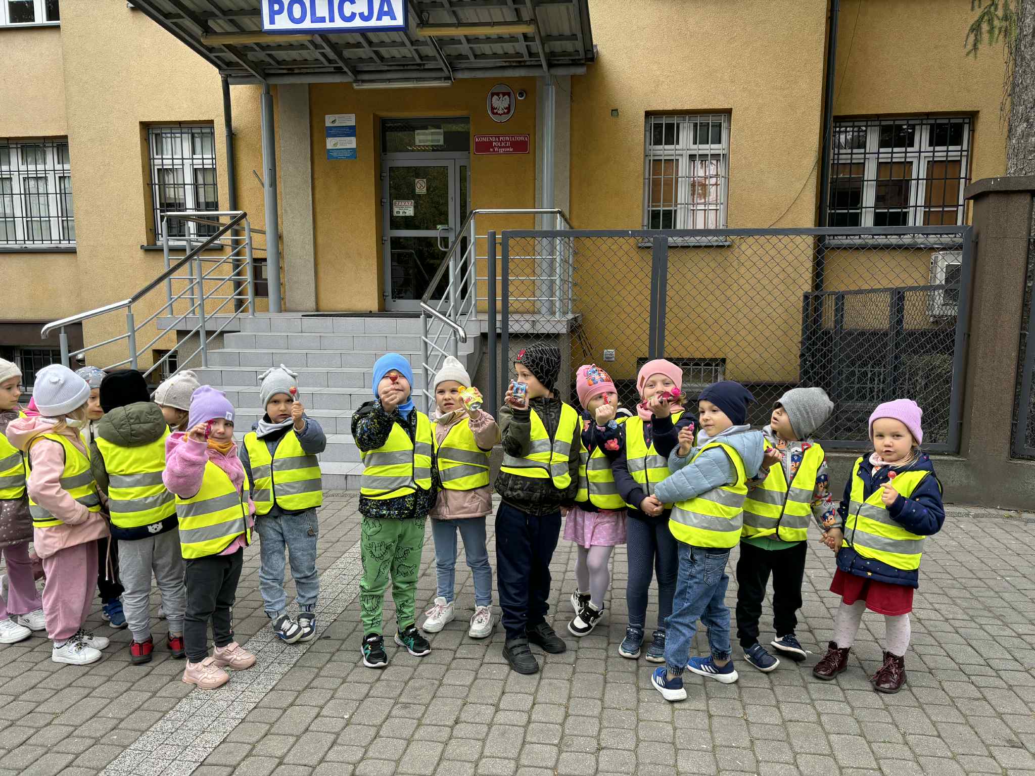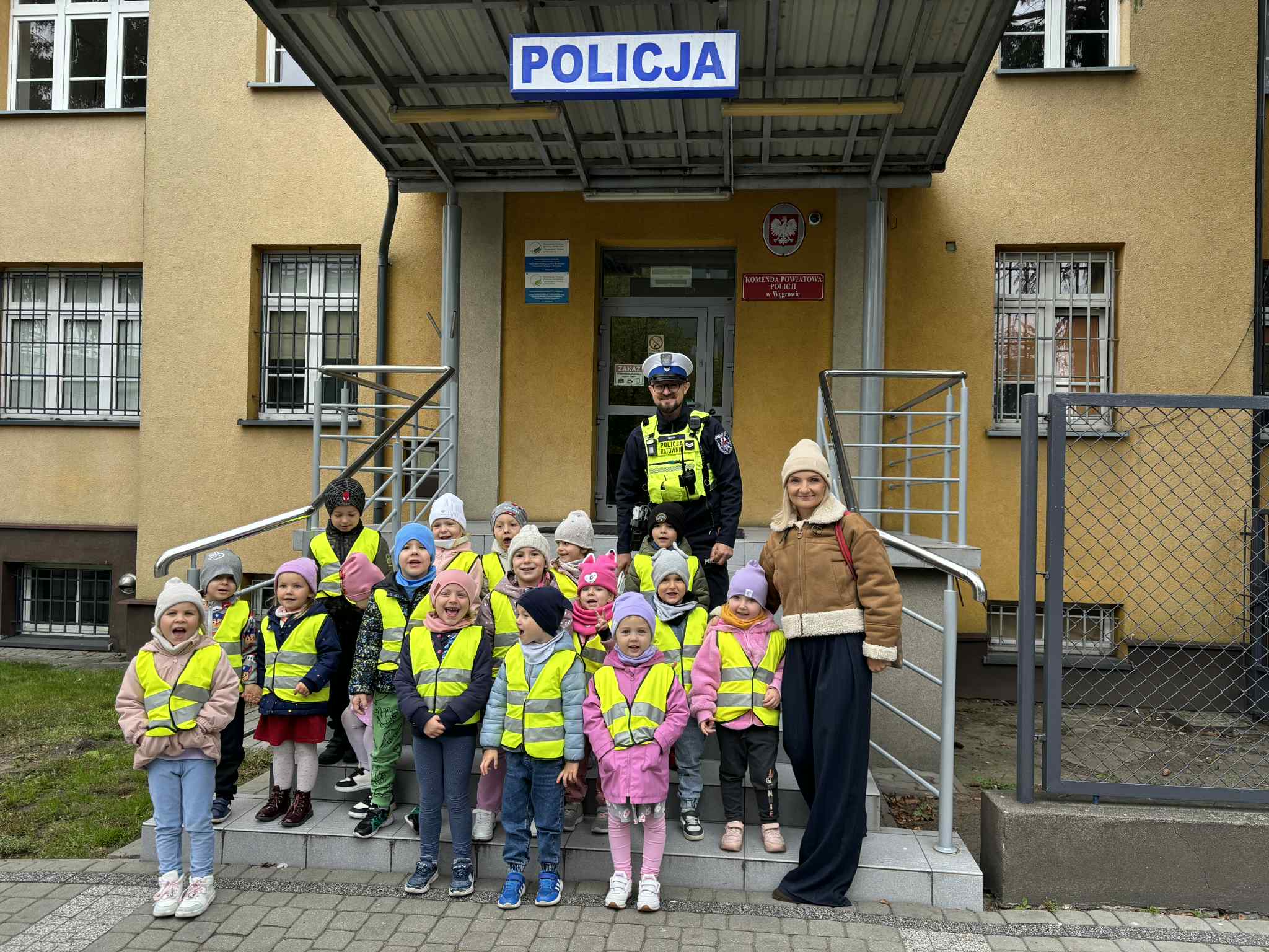 We wrześniu Pszczółki zapoznawały się z elementarnymi zasadami ruchu drogowego. Przed Powiatową Komedą Policji w Węgrowie spotkały się z policjantem Tomkiem i uczyły się poprawnego przechodzenia przez jezdnię. Pan policjant przybliżył dzieciom podstawowe zasady bezpiecznego poruszania się po drogach. Dowiedziały się , jak ważne jest właściwe zachowanie się uczestnika ruchu drogowego oraz konieczność noszenia ubrań i obuwia posiadającego elementy odblaskowe. Przedszkolaki zadawały pytania oraz dzieliły się doświadczeniami. Mamy nadzieję, że spotkanie na długo pozostanie w pamięci dzieci.