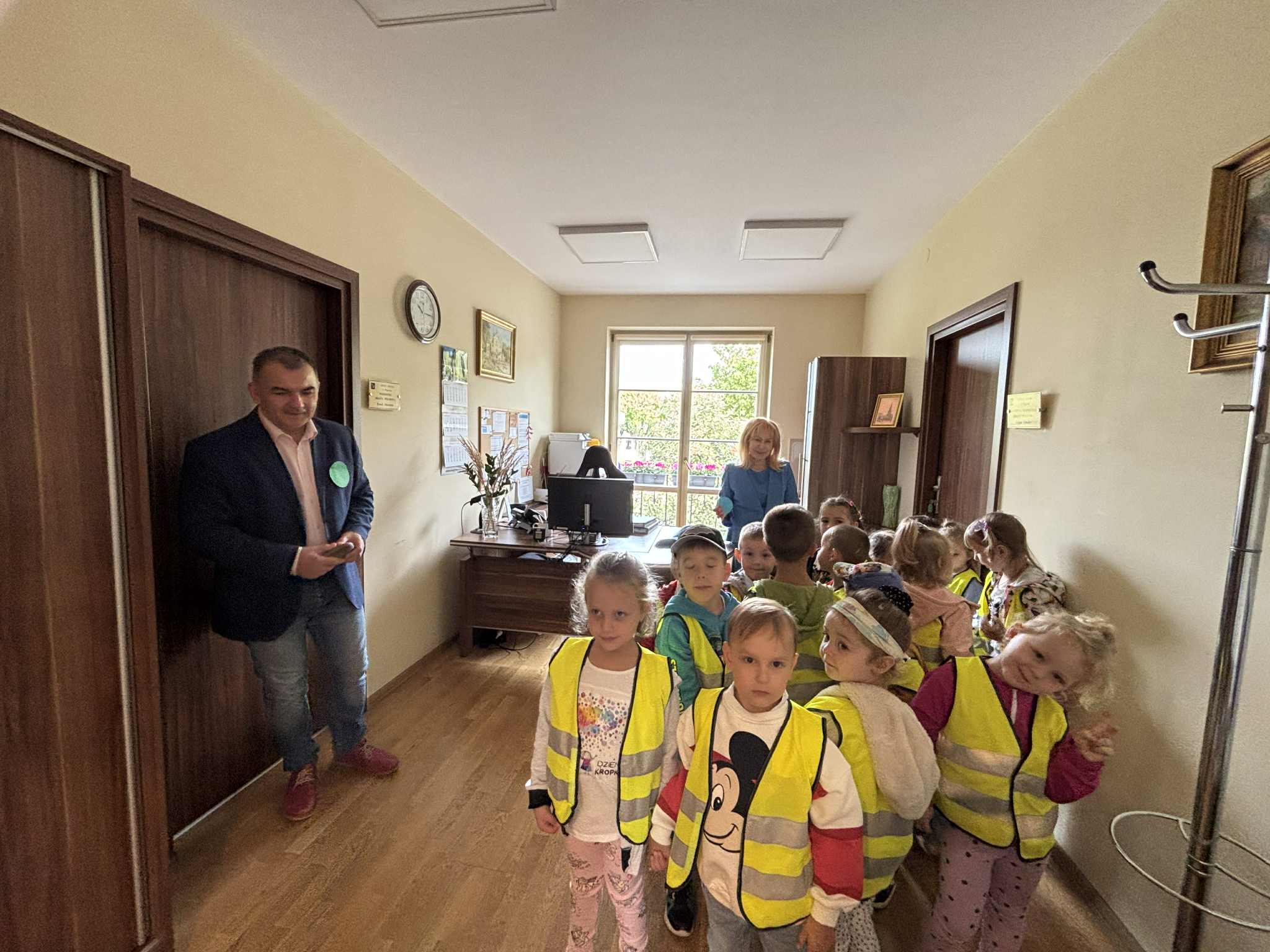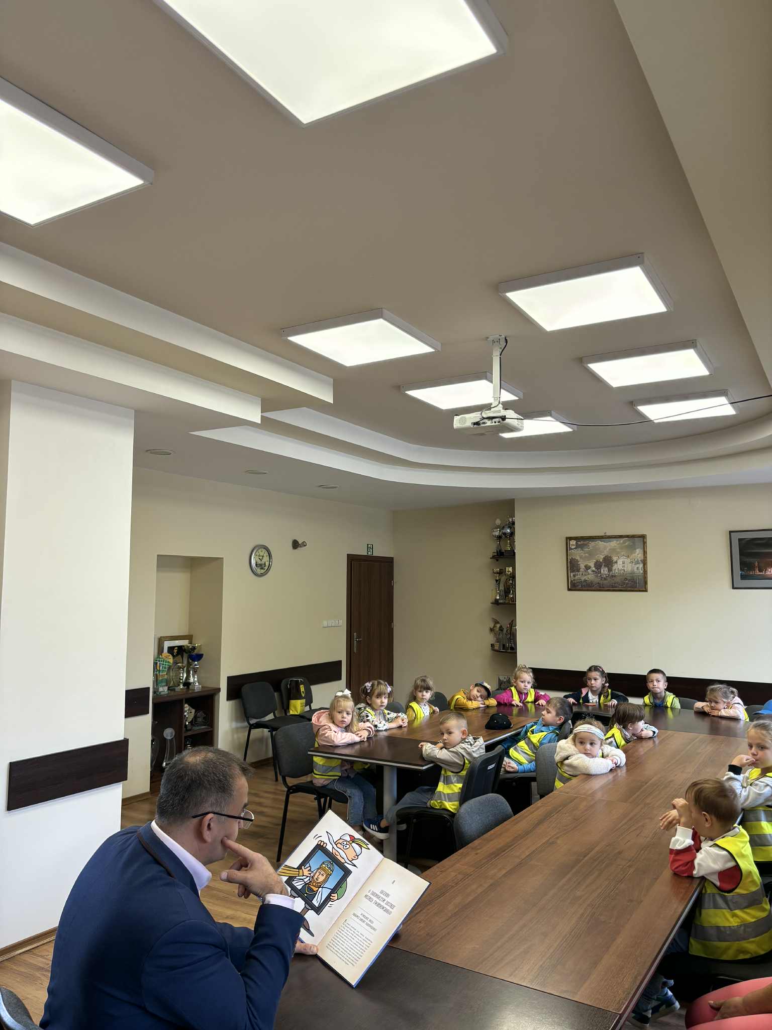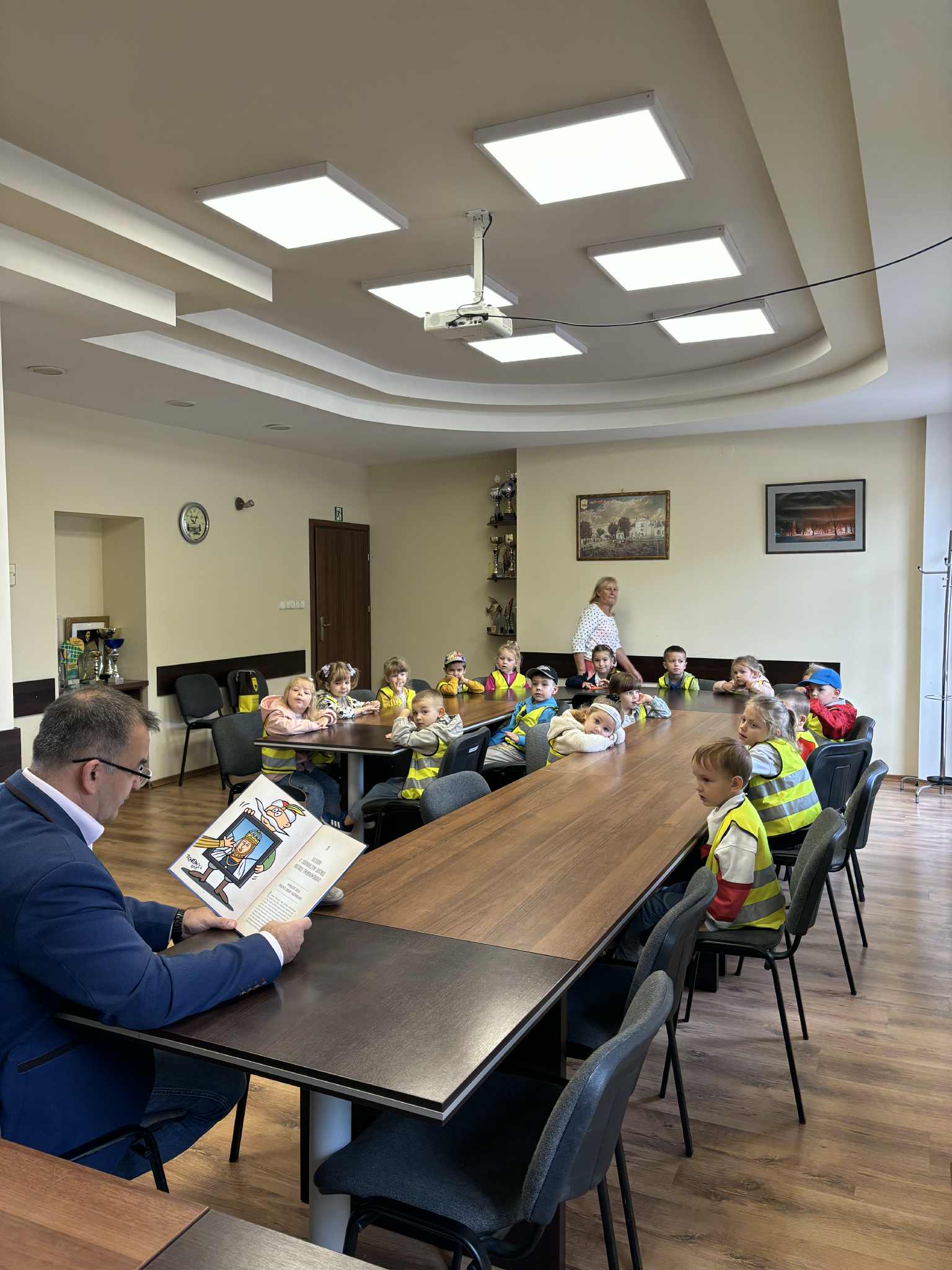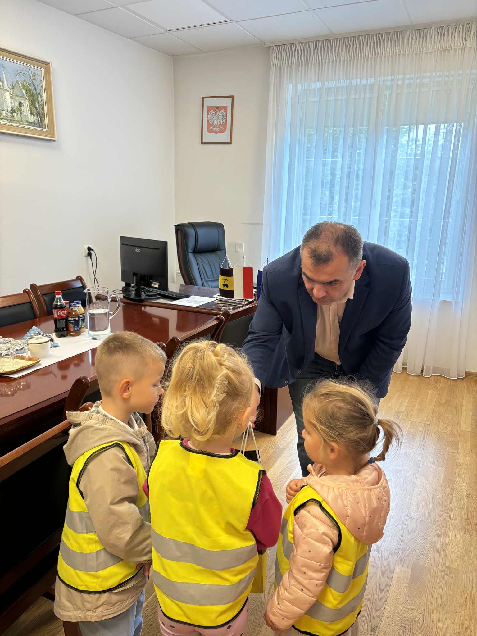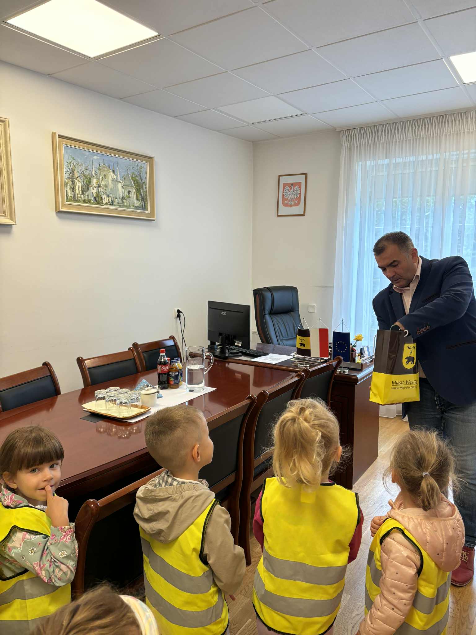 W minionym tygodniu dzieci z grupy Pszczółek odwiedziły w Urzędzie Miasta Węgrowa Burmistrza Miasta Pana Pawła Marchelę. Okazją do spotkania było realizacja treści na temat naszego miasta, jego zabytków i teraźniejszości. Pan Burmistrz przeczytał legendę o tajemniczym lustrze Twardowskiego z książki pt.” Węgrów miasto dziwów i czarów iście godnych samego Twardowskiego. Dzieci na dobre rozgościły się w gabinecie Pana Burmistrza, chętnie zasiadały w fotelu najważniejszej osoby w mieście. Jednocześnie przedszkolaki włączyły władze miasta i pracowników urzędu do zabawy z okazji Dnia Kropki. ”Pszczółki” obdarowane w przybory do pisania i odblaski radosne wróciły do przedszkola.