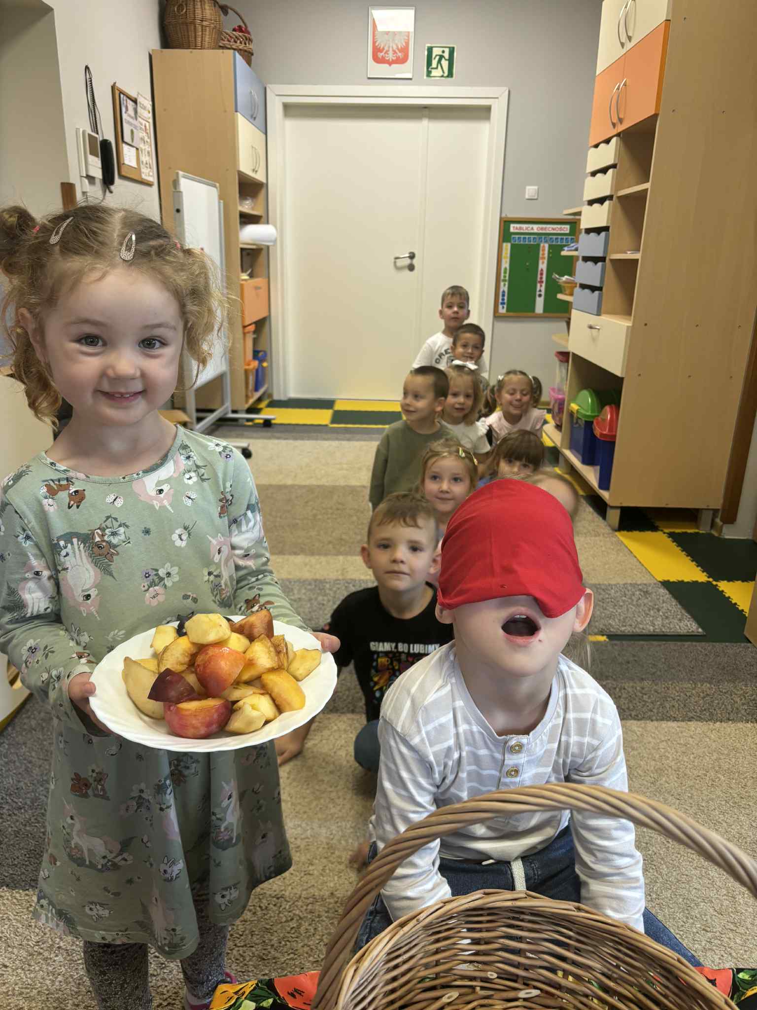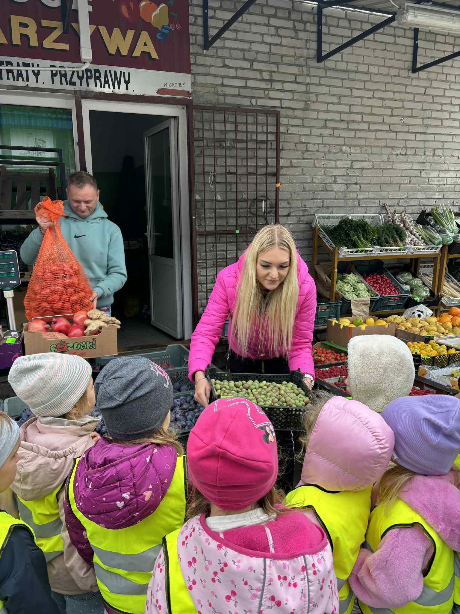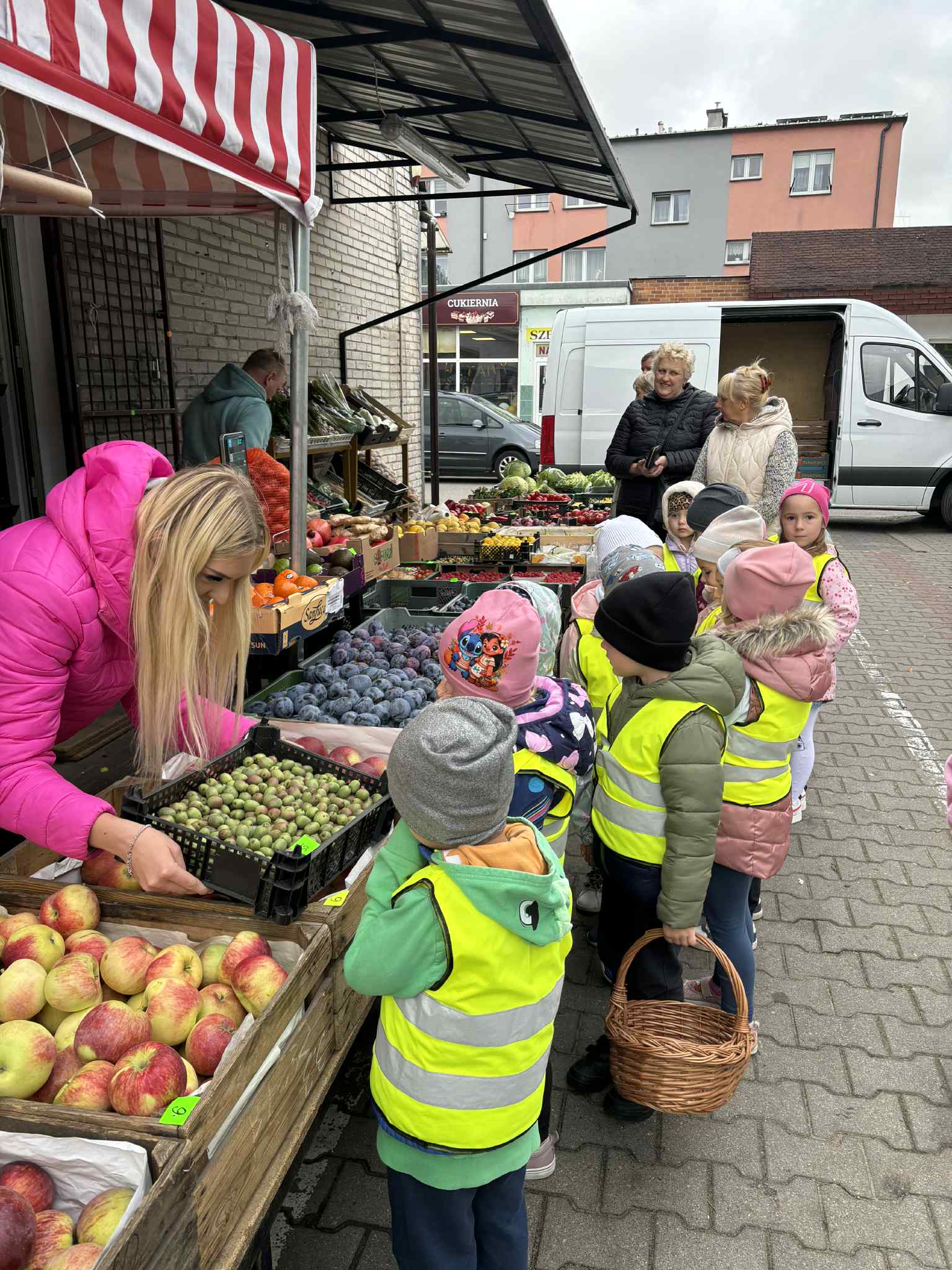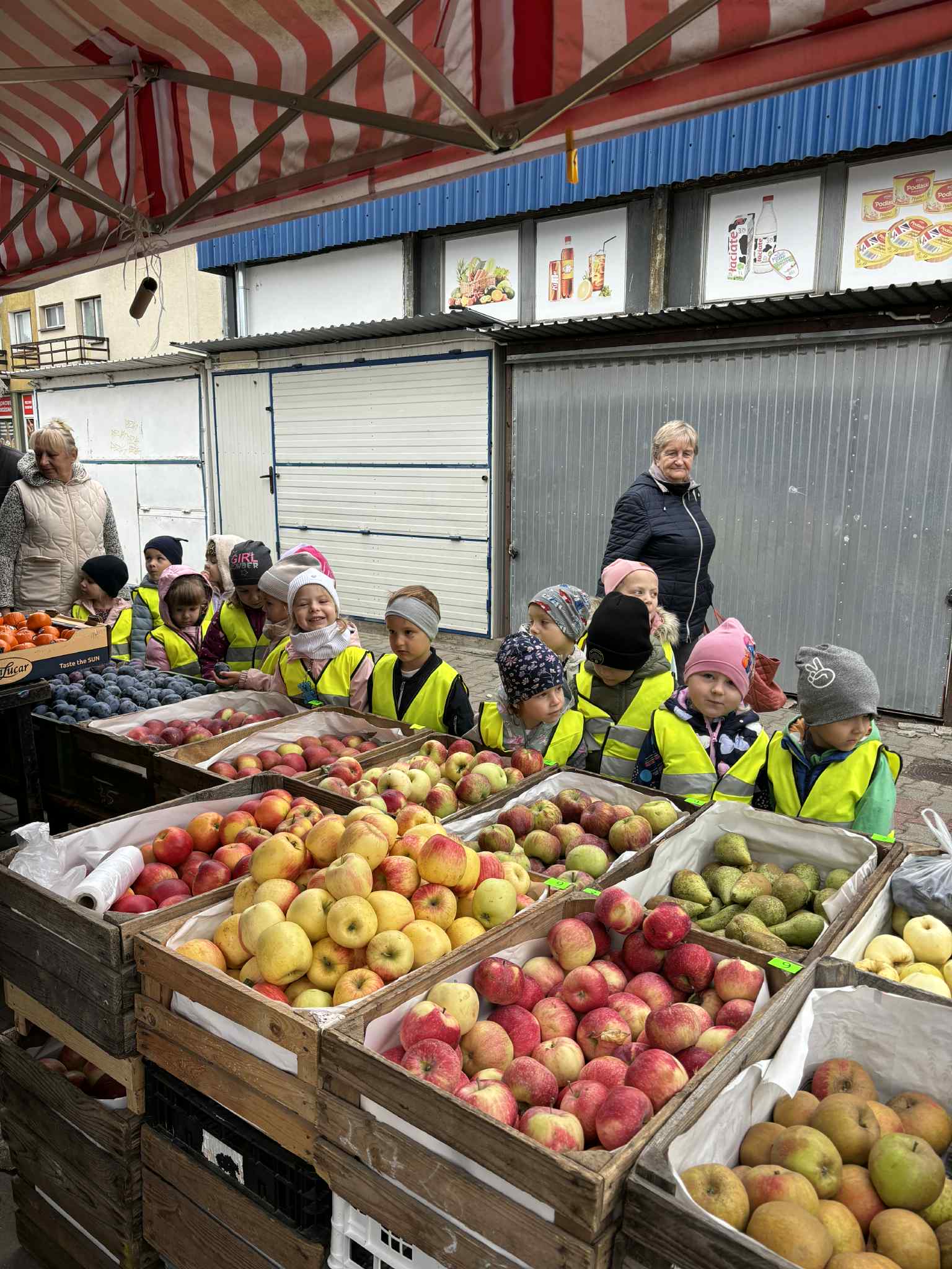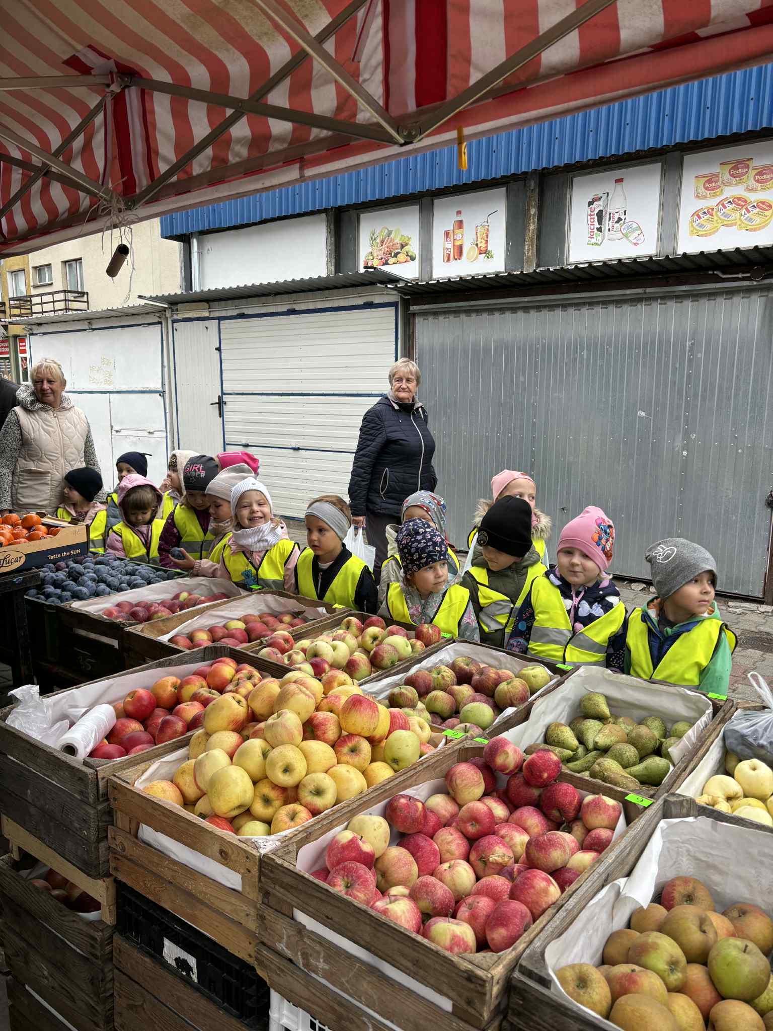 Jesień to pora roku, która obfituje w wiele kolorowych i soczystych owoców, które dojrzewają w naszych sadach. Pszczółki wyruszyły we wrześniu w ,,poszukiwaniu witamin”. Odwiedzili stragan owocowo-warzywny na ulicy Rynkowej .Przedszkolaki poszerzały swoją wiedzę o jabłkach: poznawały budowę owocu, właściwości zdrowotne, gatunki jabłek, kolory, kształty, zapachy. Nie zabrakło również degustacji owoców – kiwi, którymi poczęstowała nas właścicielka straganu.