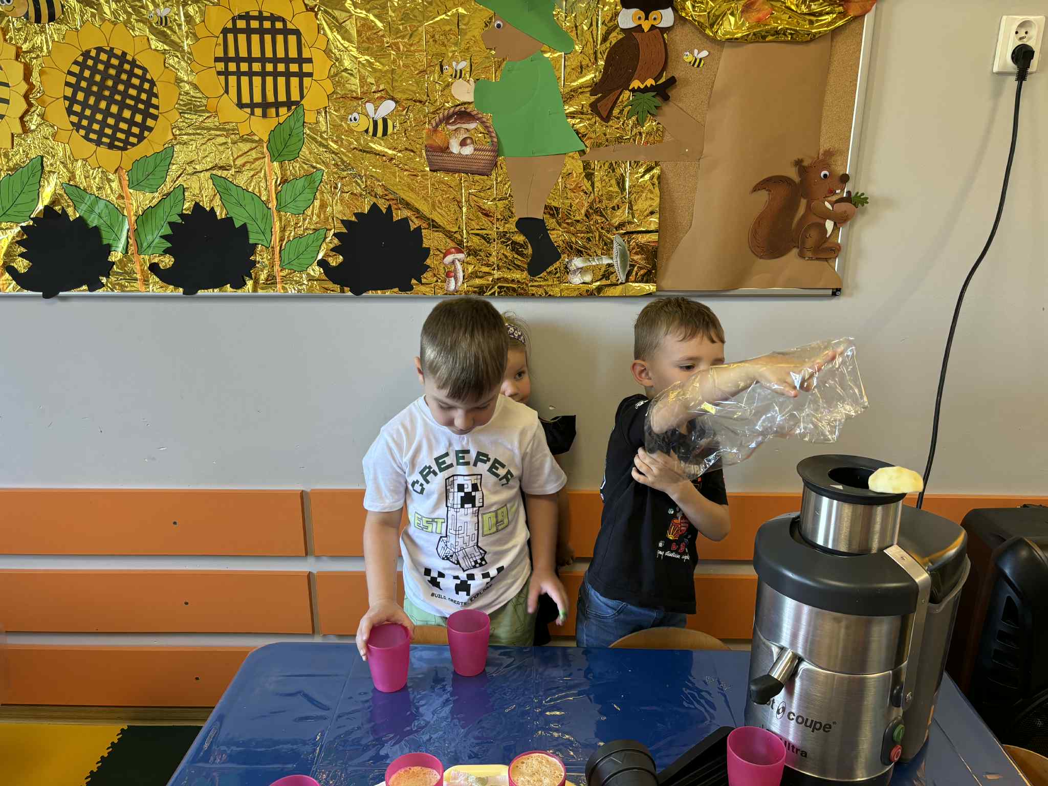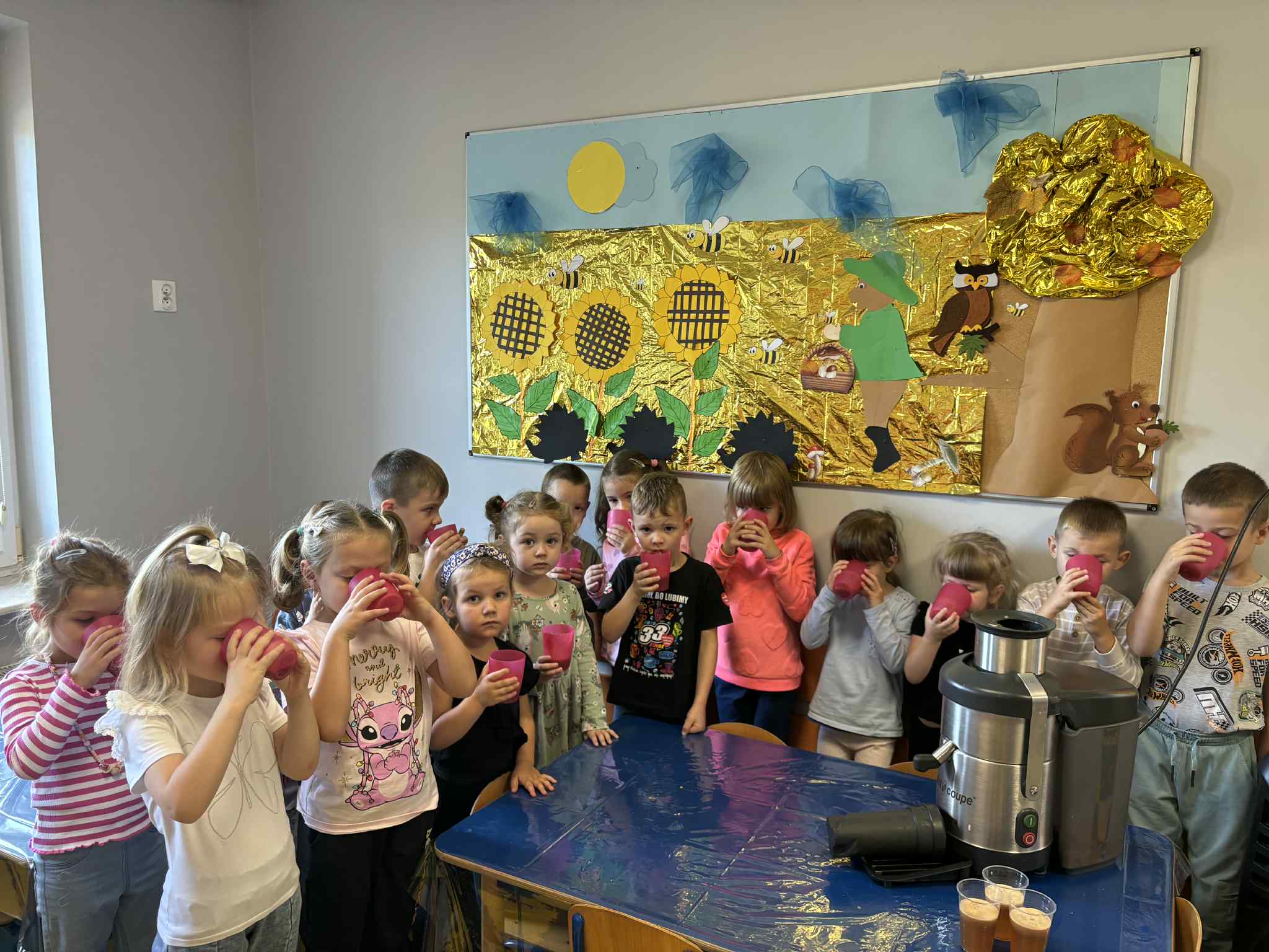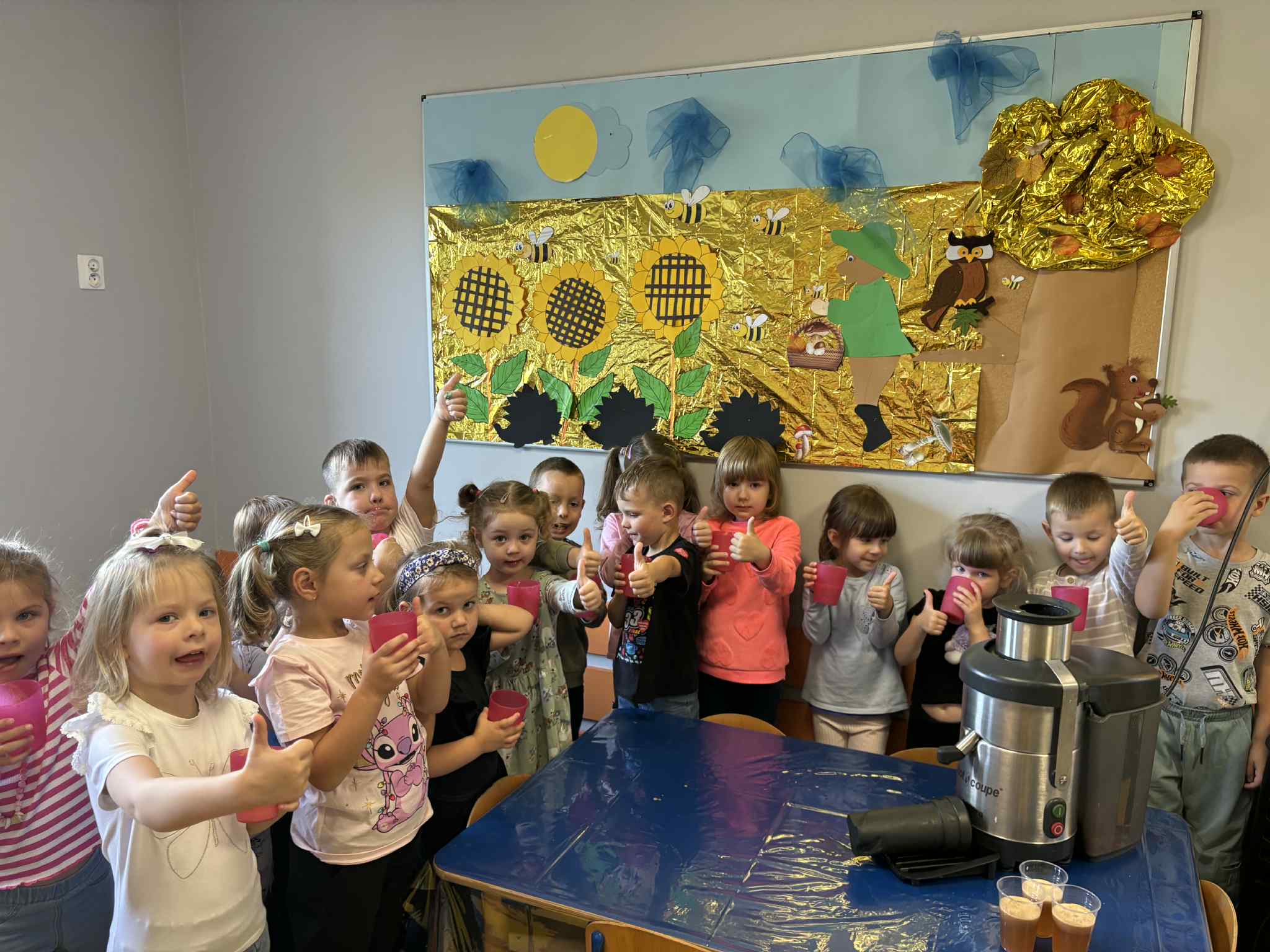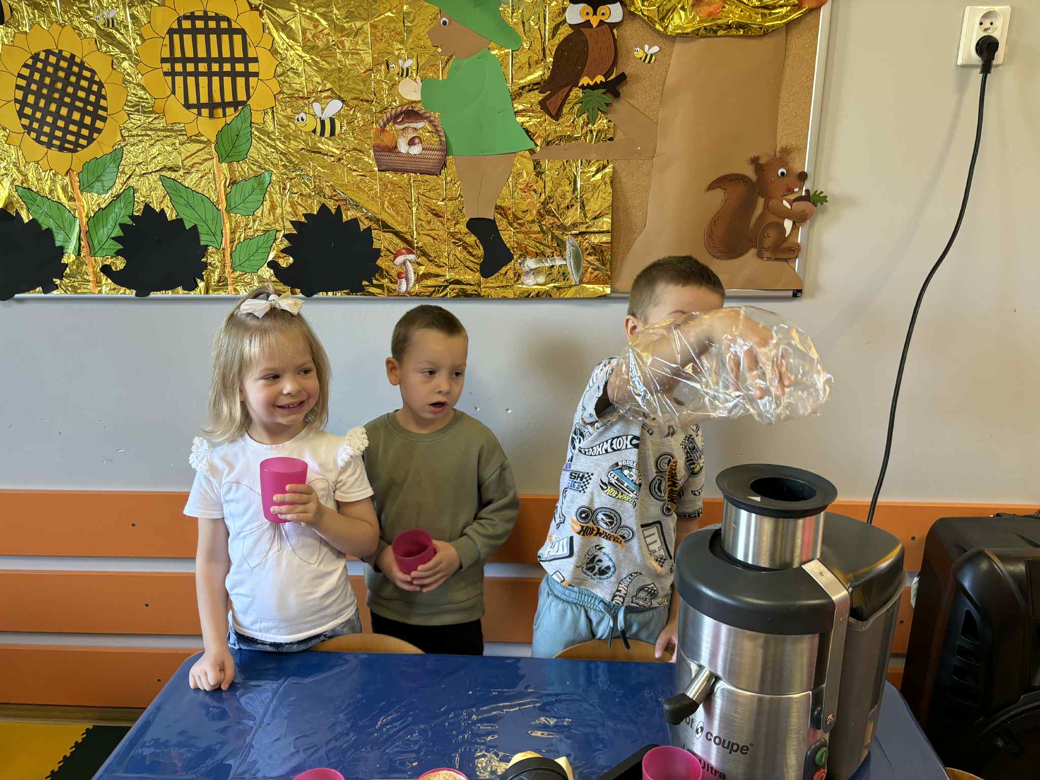 Wszyscy dobrze wiedzą jakie bogate w witaminy są soki… Soki to nie tylko doskonałe źródło witamin i cennych składników, ale są pyszniejsze niż słodycze. Przekonały się o tym dzieci z grupy „Pszczółki”, które w miniony czwartek podczas zajęć wyczarowały pyszne owocowe soki. Dzieci pełne zainteresowania i ciekawości przystąpiły do mycia owoców , później już pozostało wrzucenie ich do wyciskarki i sok gotowy. Po skończonej pracy delektowały się jego smakiem.