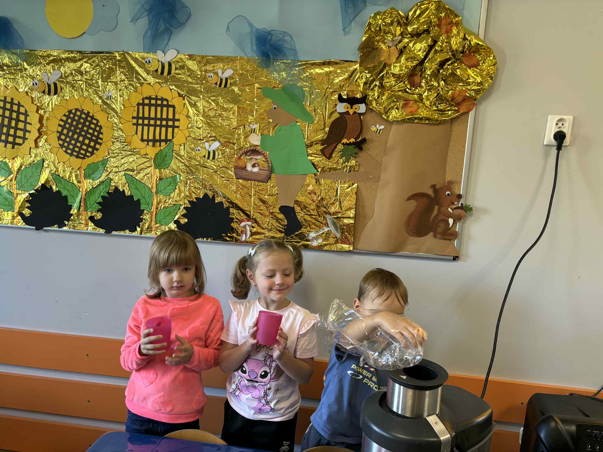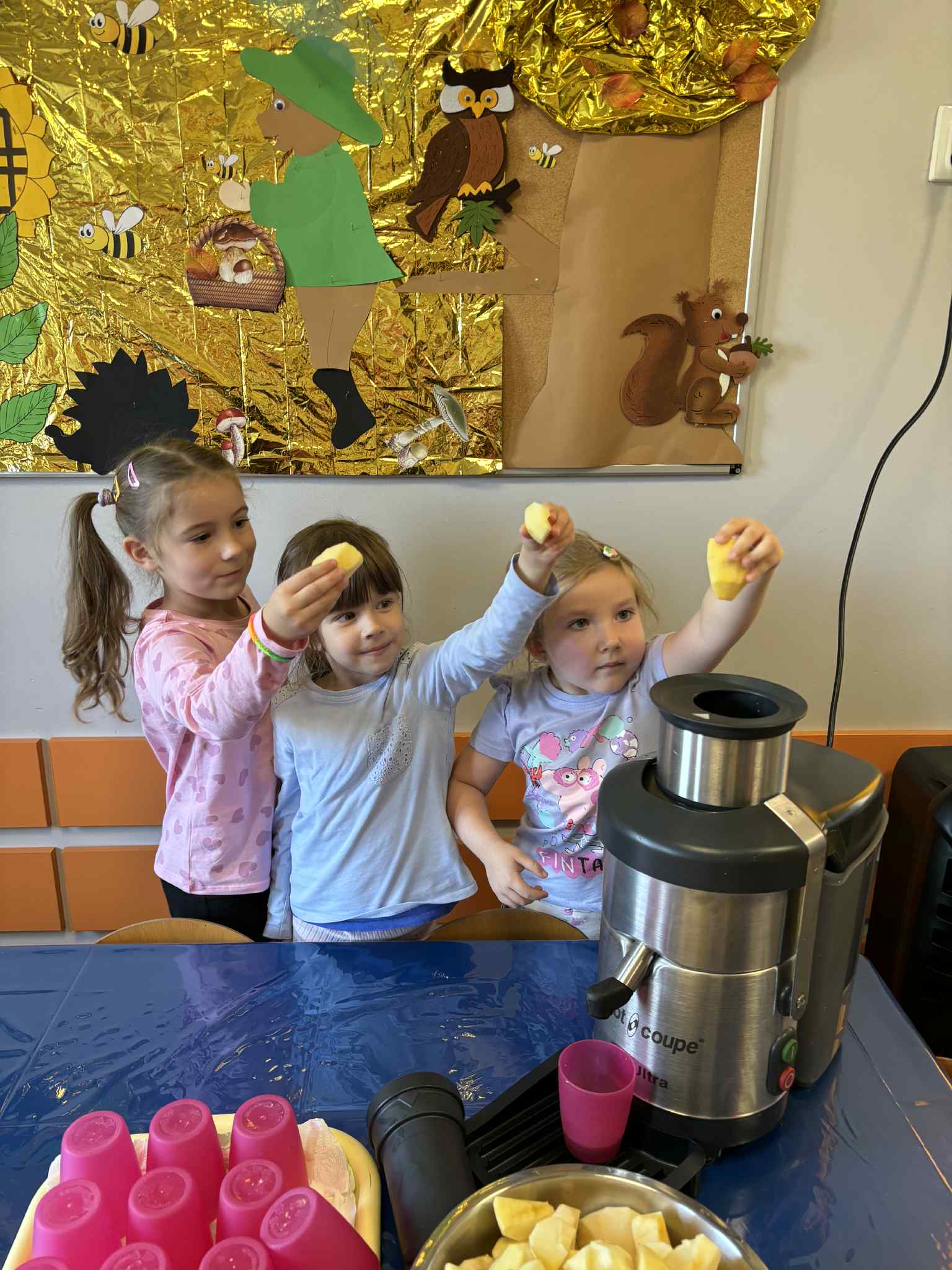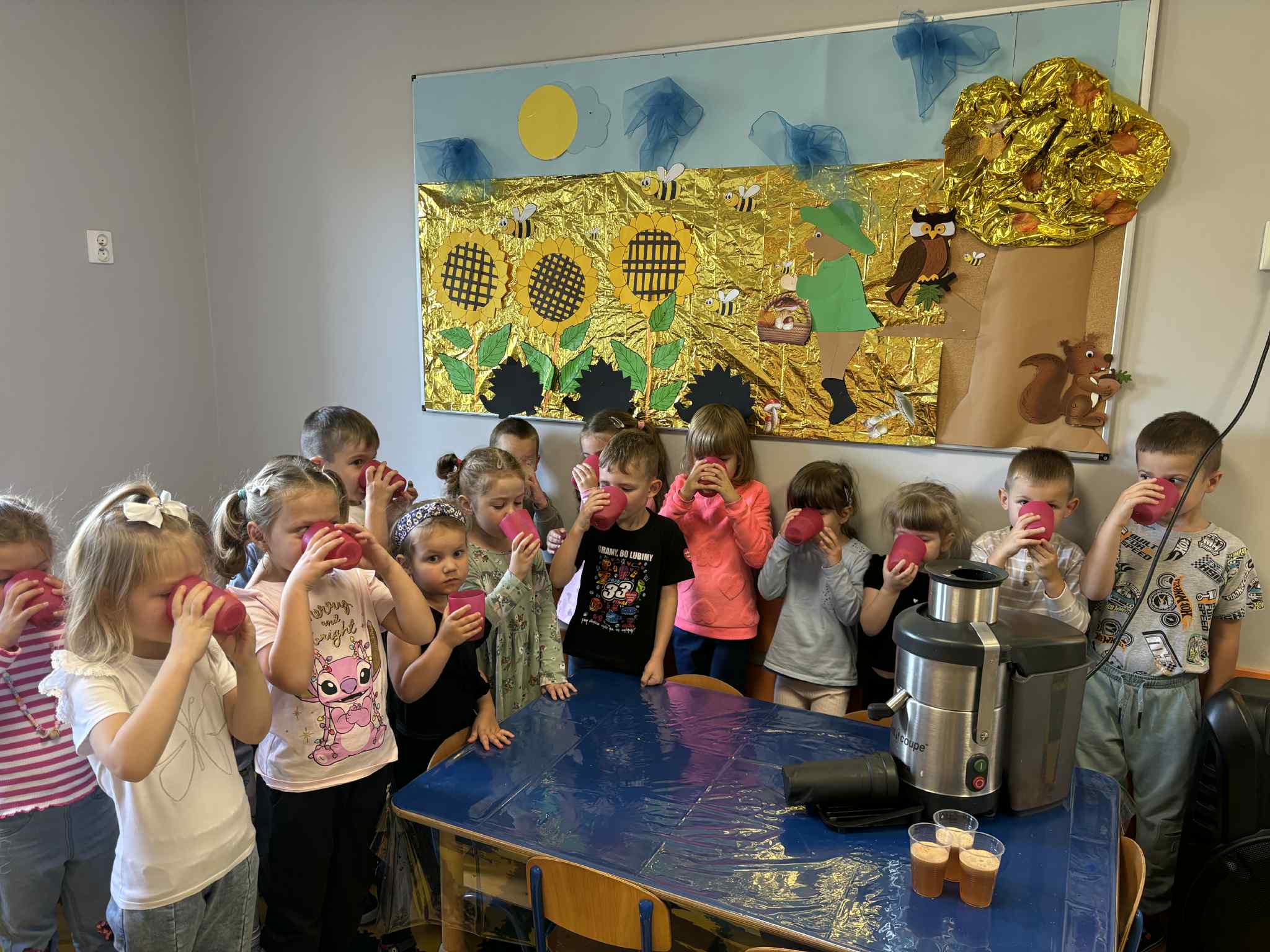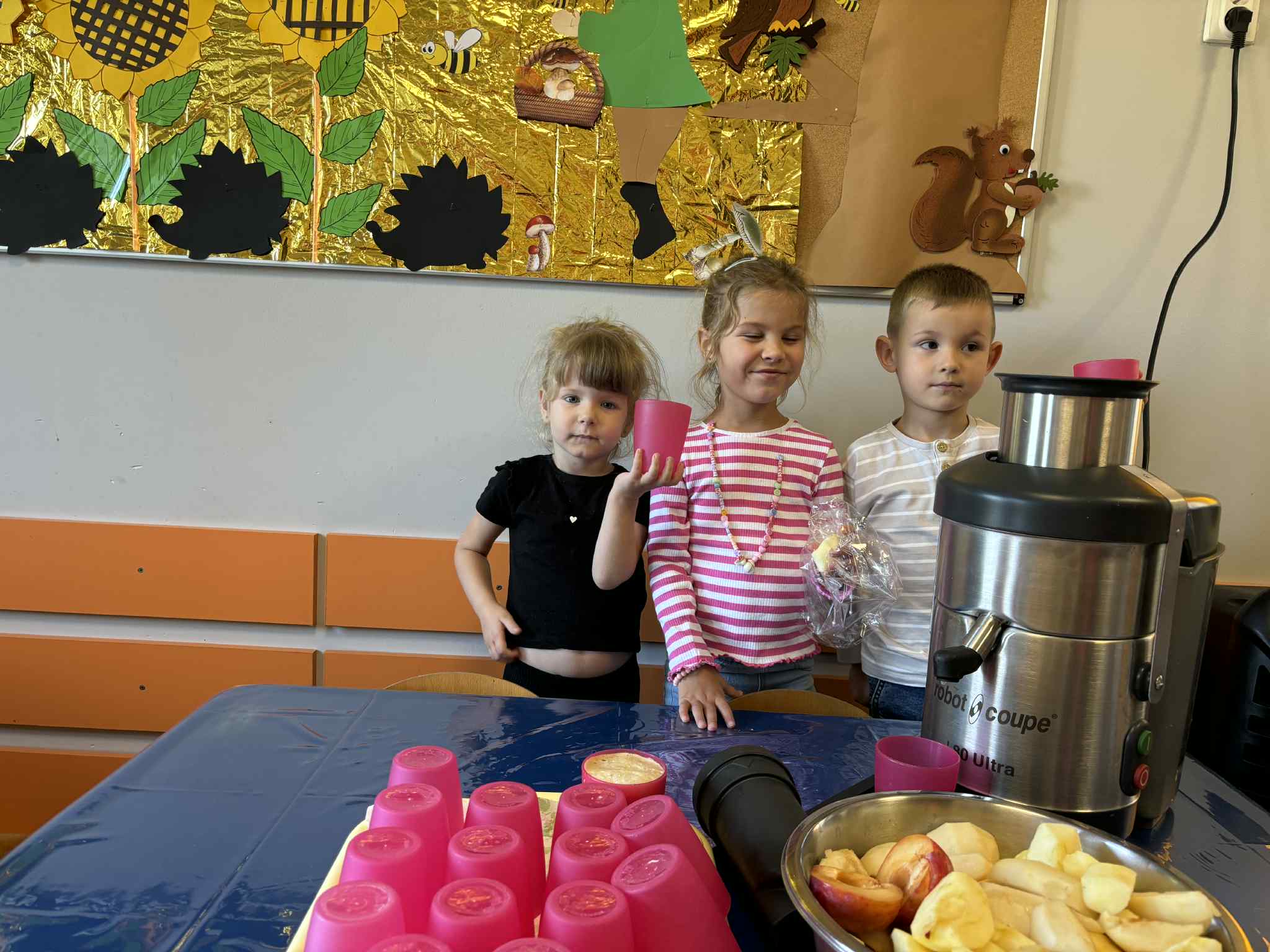 Wszyscy dobrze wiedzą jakie bogate w witaminy są soki… Soki to nie tylko doskonałe źródło witamin i cennych składników, ale są pyszniejsze niż słodycze. Przekonały się o tym dzieci z grupy „Pszczółki”, które w miniony czwartek podczas zajęć wyczarowały pyszne owocowe soki. Dzieci pełne zainteresowania i ciekawości przystąpiły do mycia owoców , później już pozostało wrzucenie ich do wyciskarki i sok gotowy. Po skończonej pracy delektowały się jego smakiem.