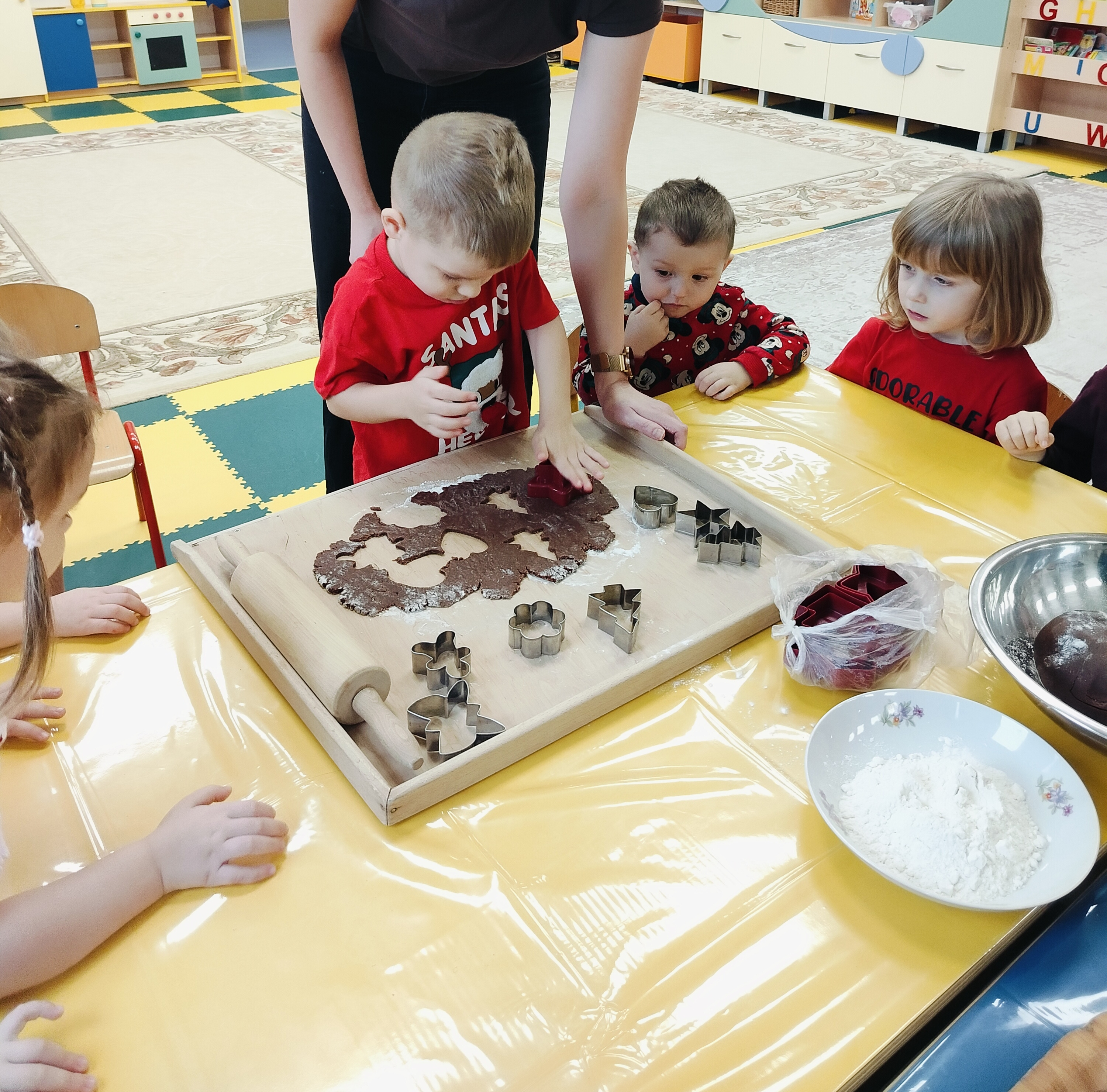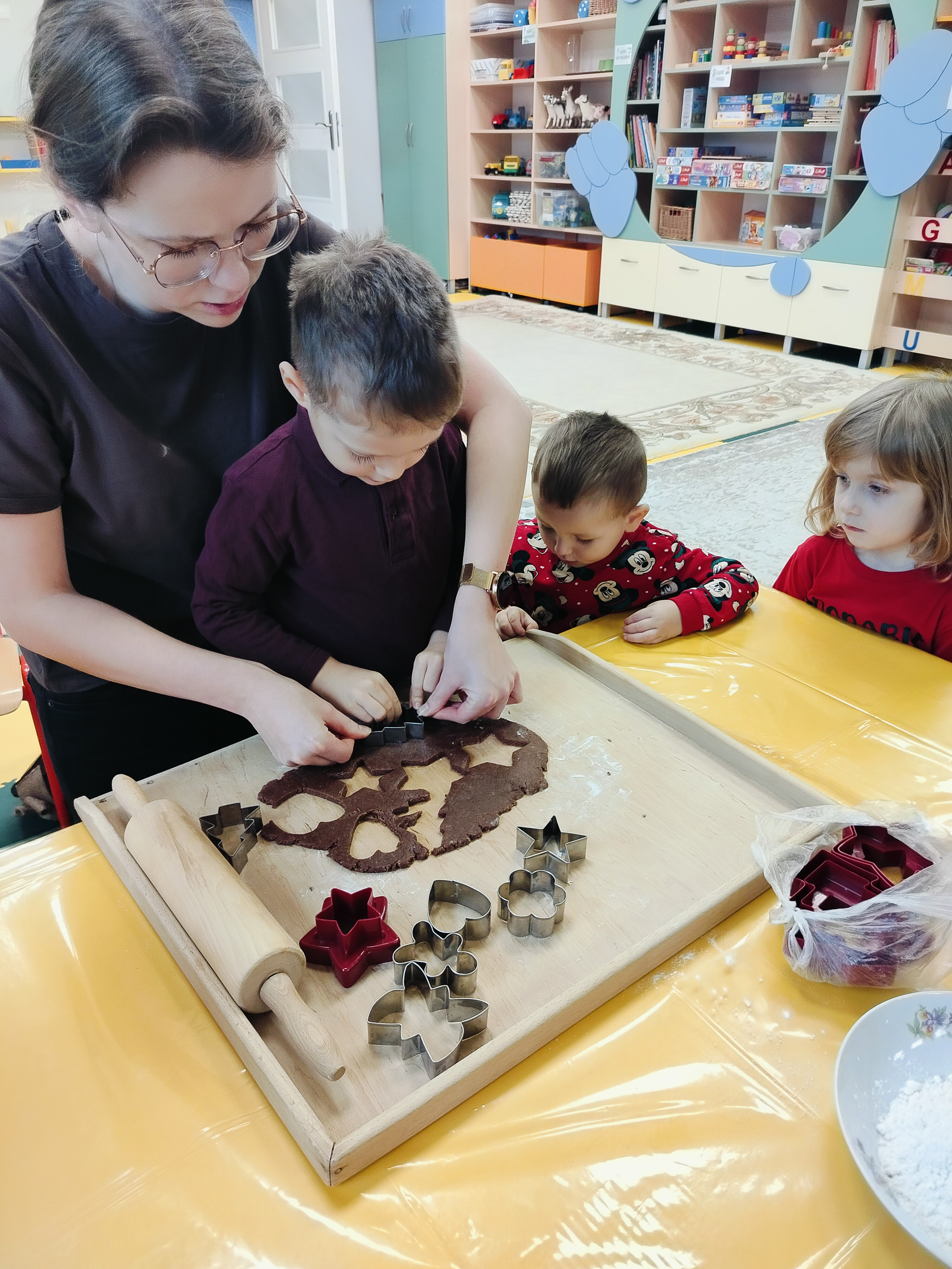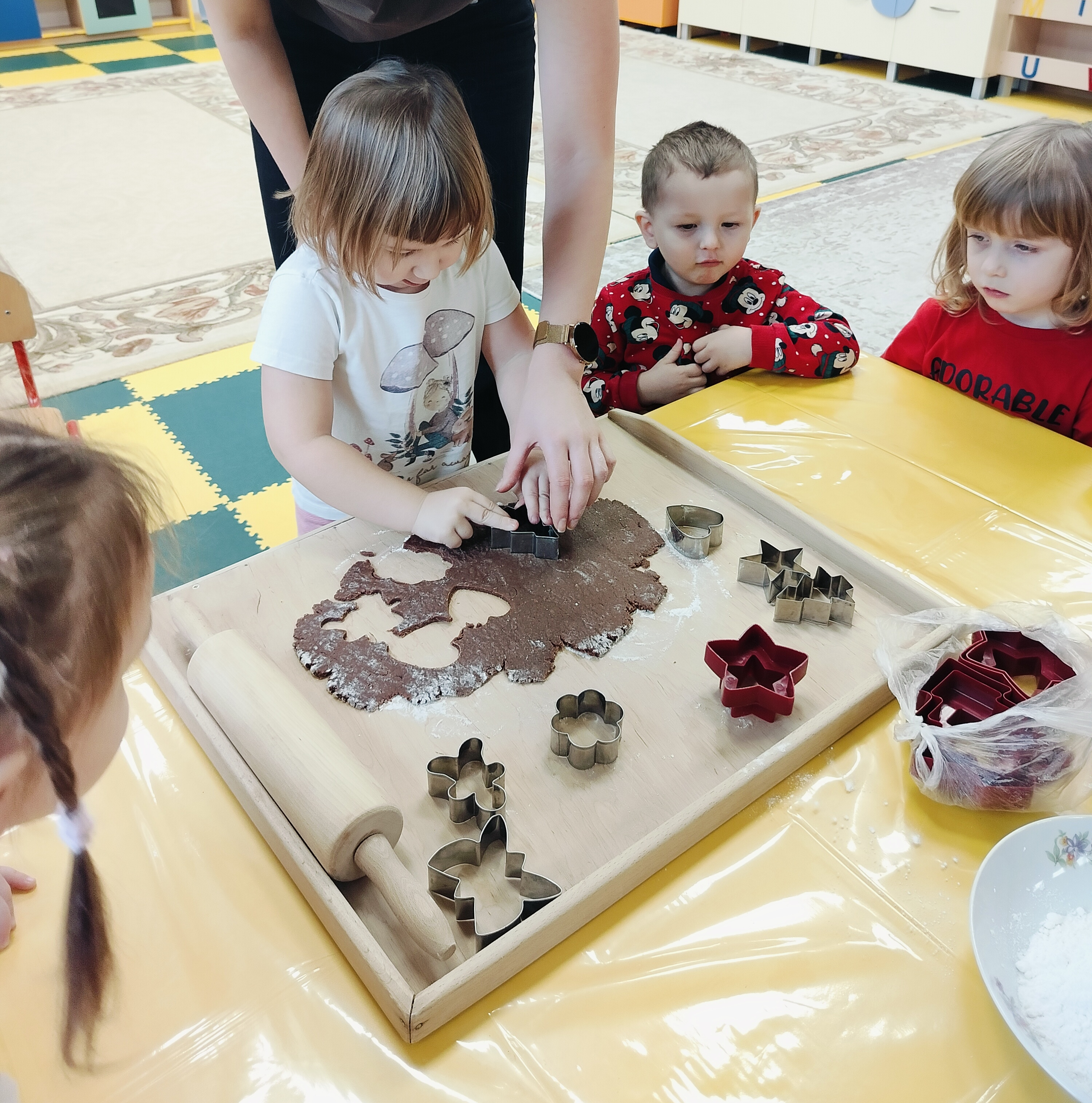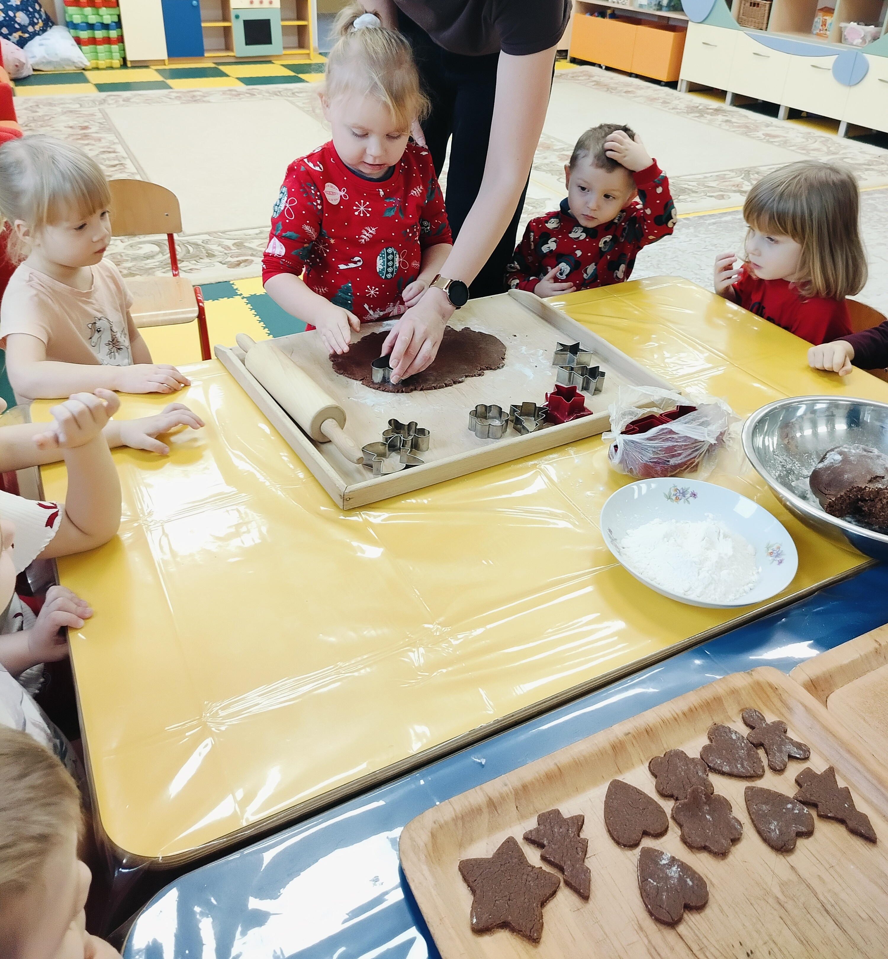 Pieczenie pierniczków to dla naszych przedszkolaków wyjątkowy czas. Dzieci z wielkim zaangażowaniem pracowały przy pachnącym cieście, ugniatając je i wycinając kształty. W całej sali unosił się zapach korzennych przypraw, a w tle słychać było kolędy. To piękna, świąteczna tradycja, która łączy pracę, radość i wspólne przeżywanie świąt.