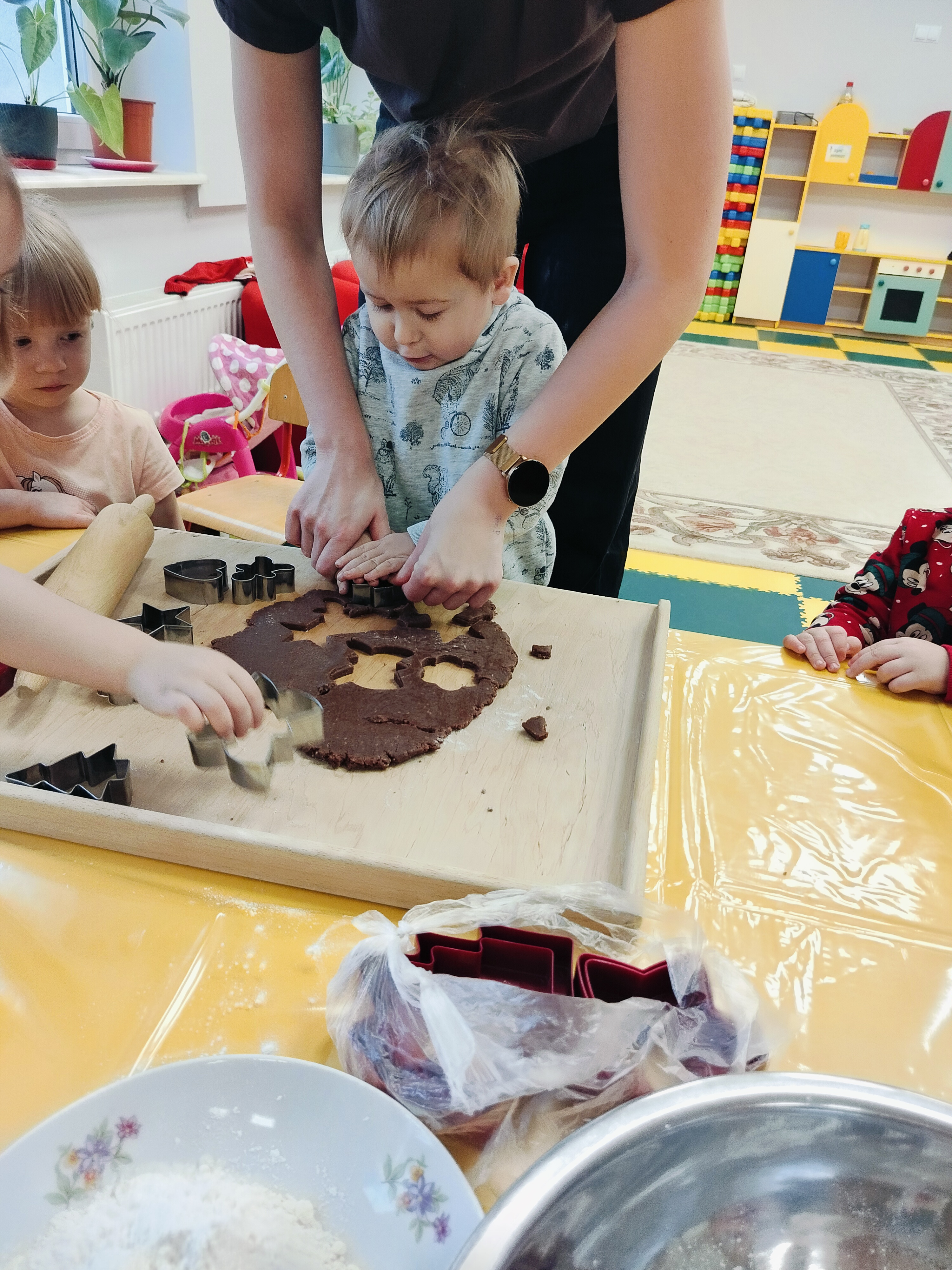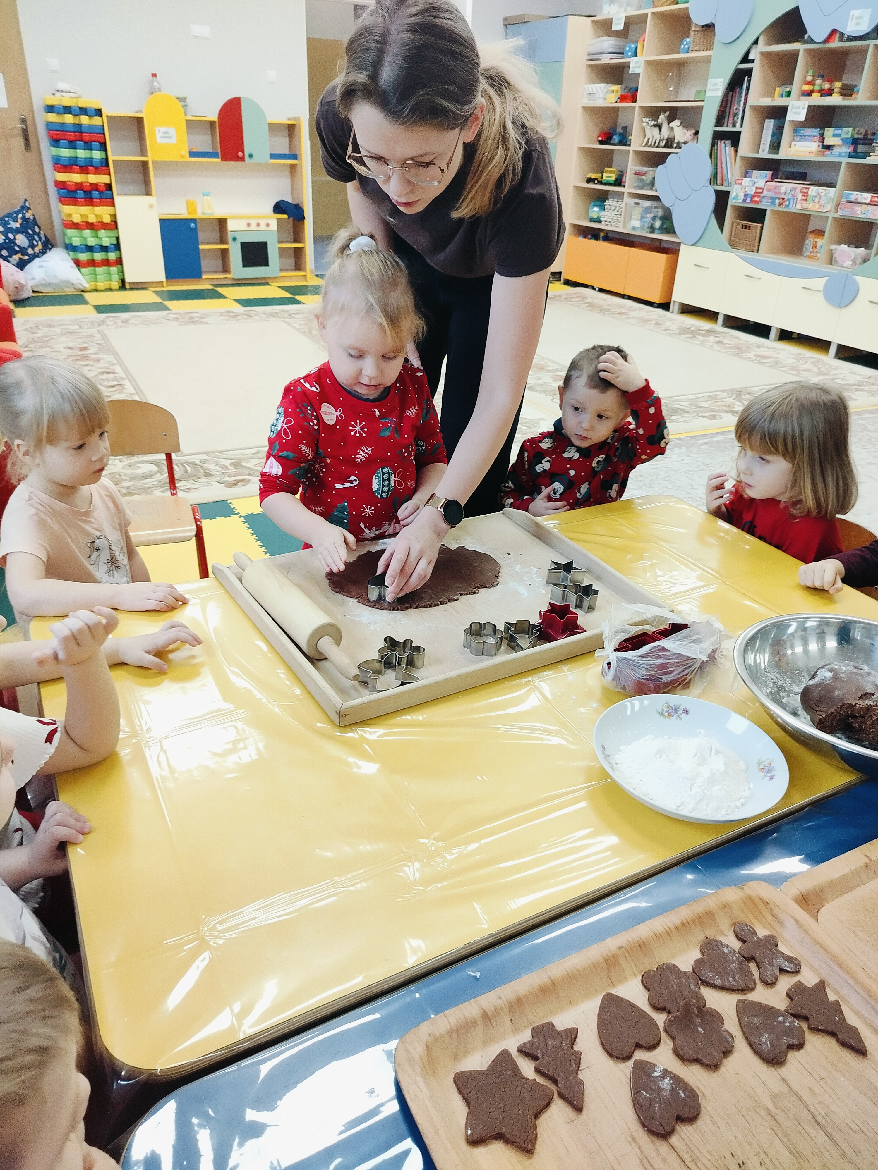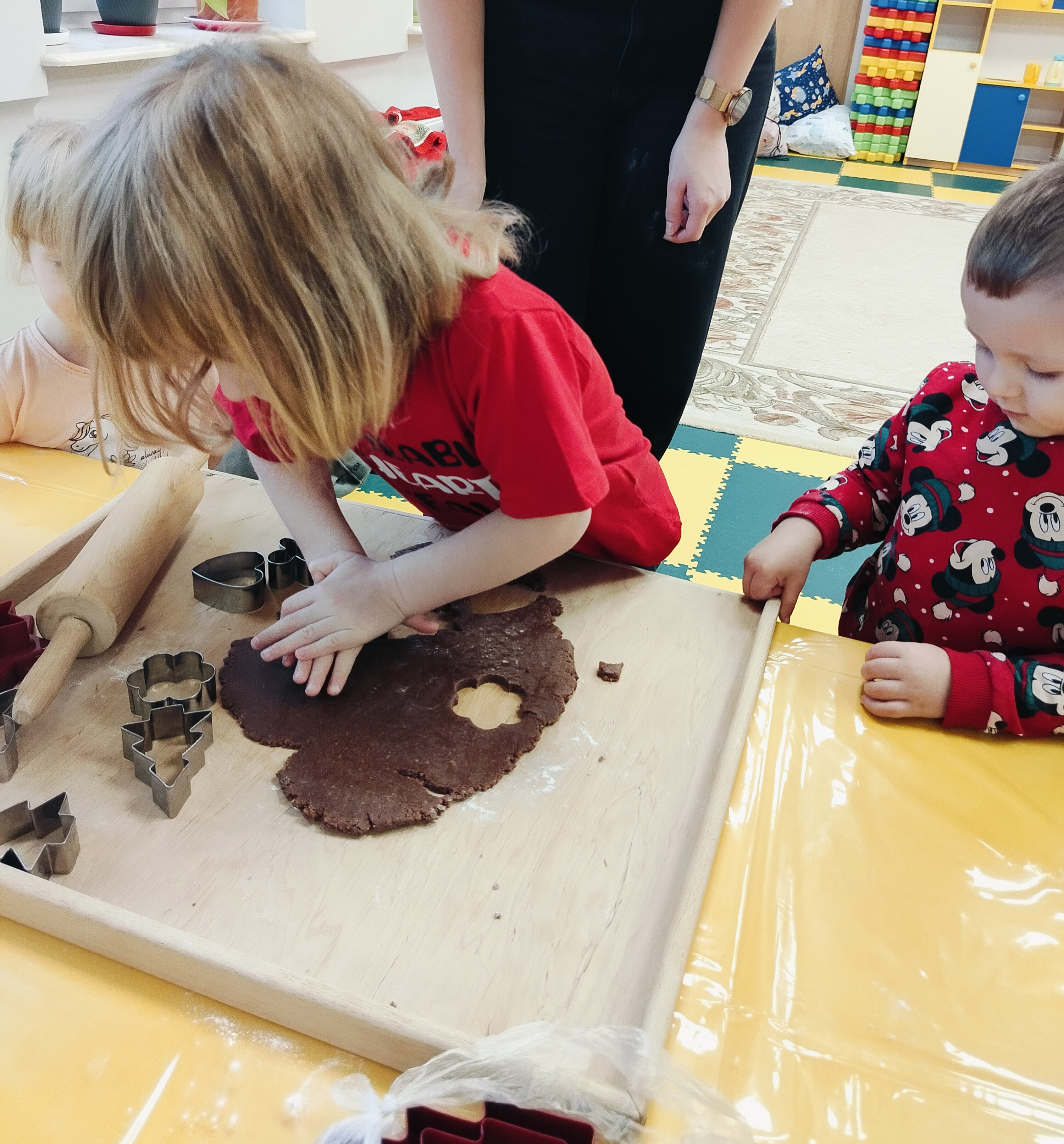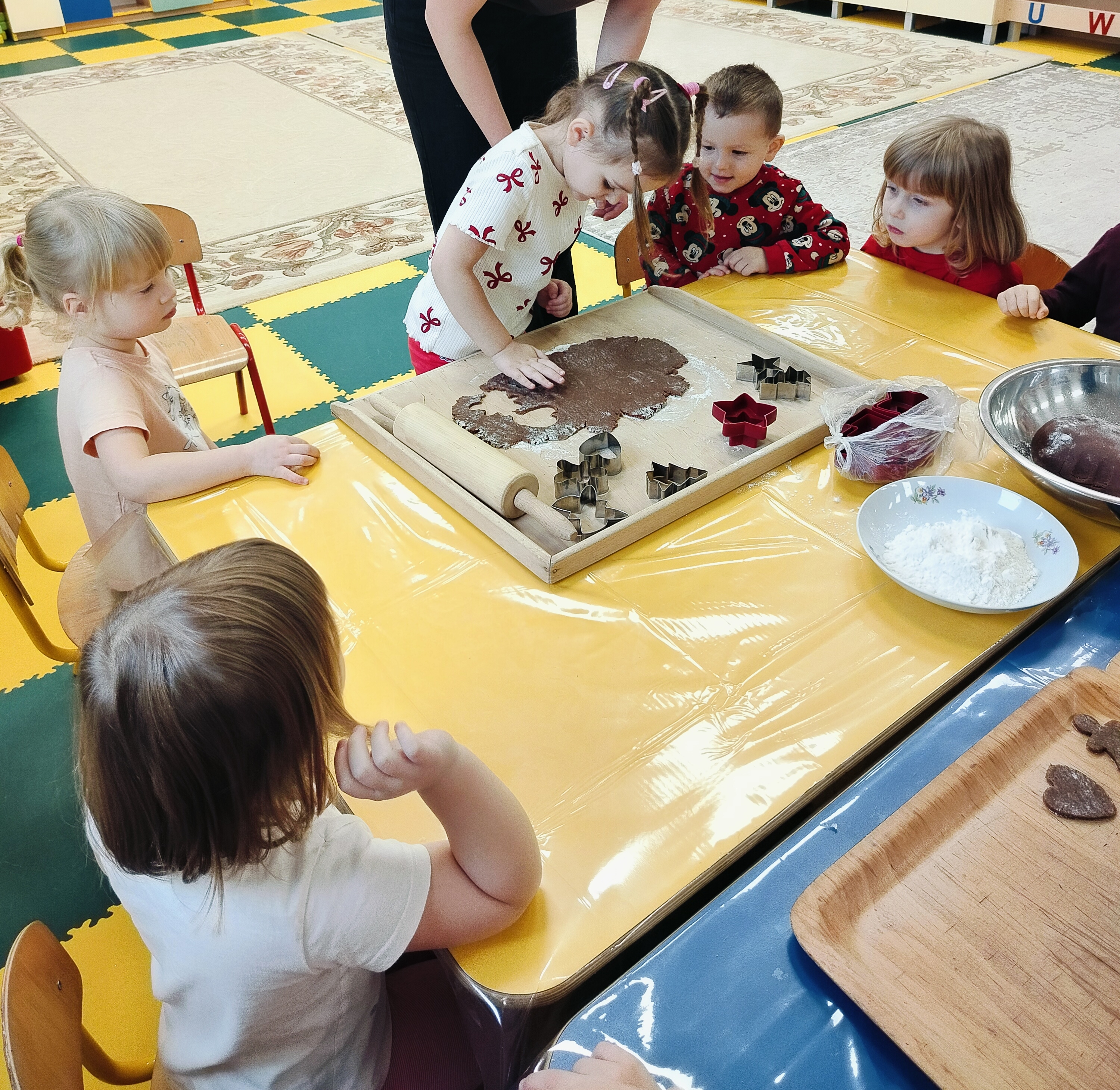 Pieczenie pierniczków to dla naszych przedszkolaków wyjątkowy czas. Dzieci z wielkim zaangażowaniem pracowały przy pachnącym cieście, ugniatając je i wycinając kształty. W całej sali unosił się zapach korzennych przypraw, a w tle słychać było kolędy. To piękna, świąteczna tradycja, która łączy pracę, radość i wspólne przeżywanie świąt.
