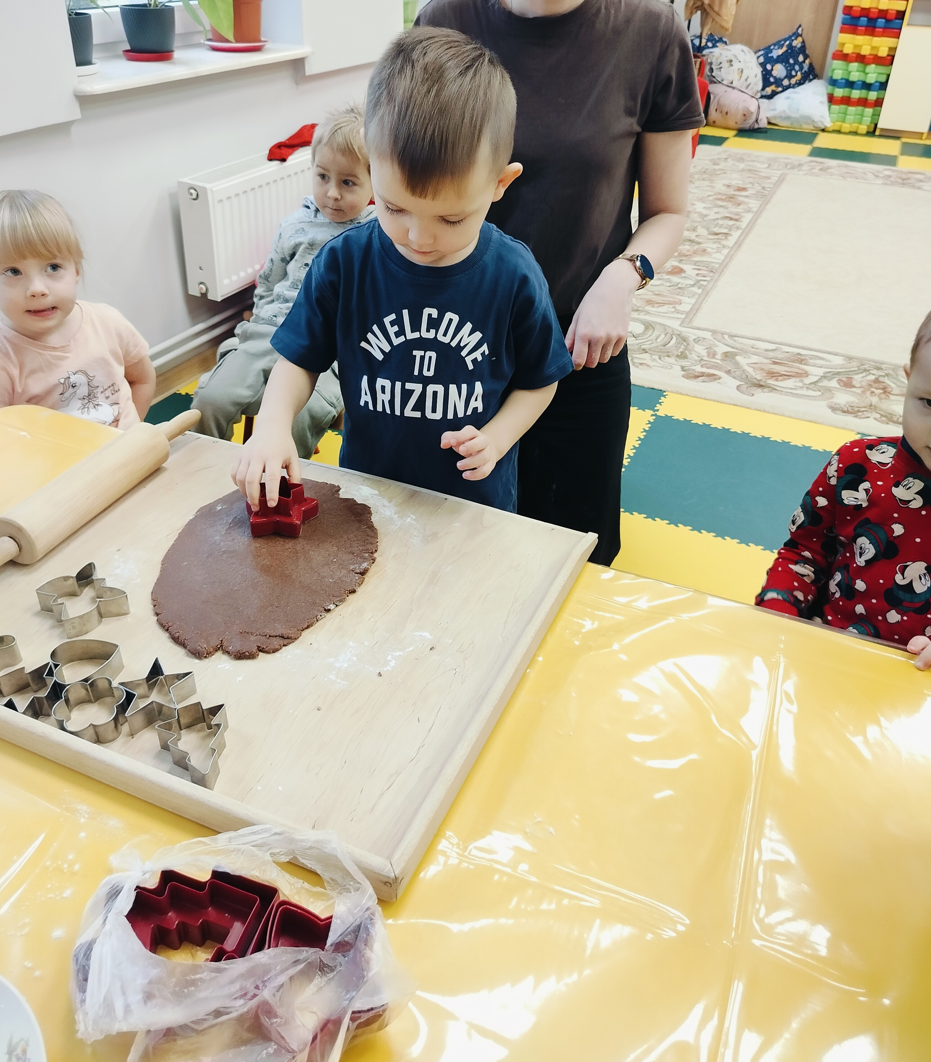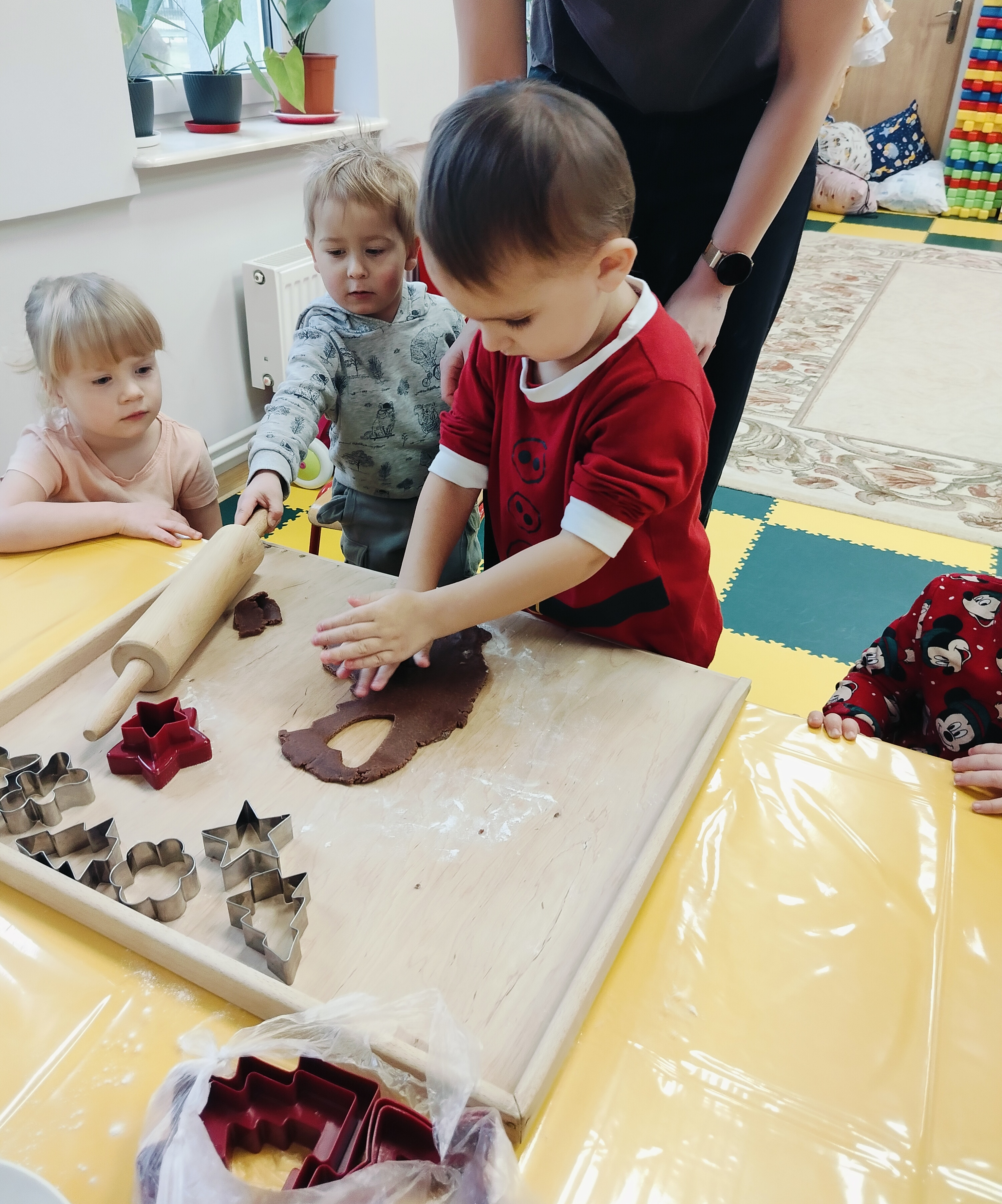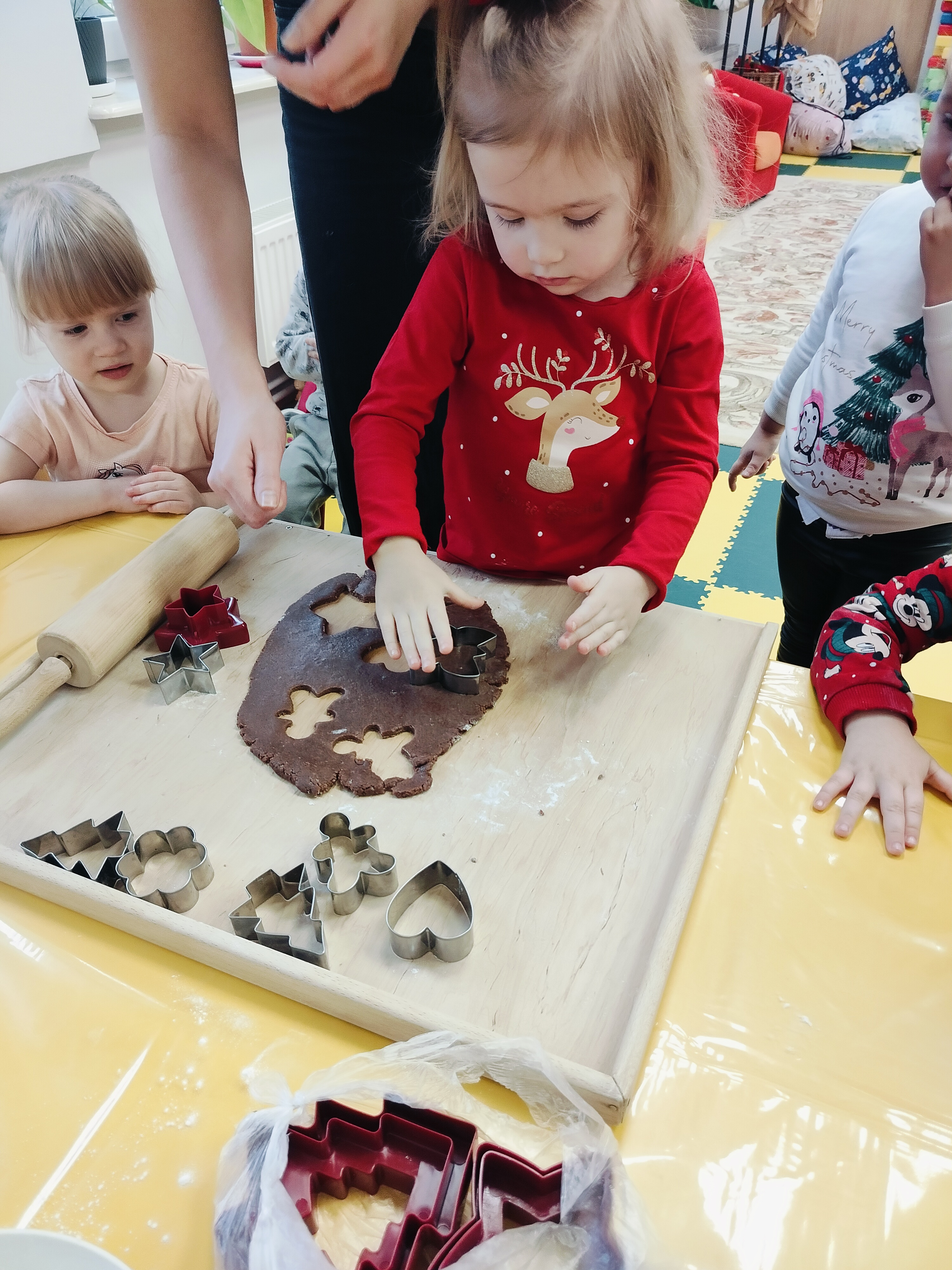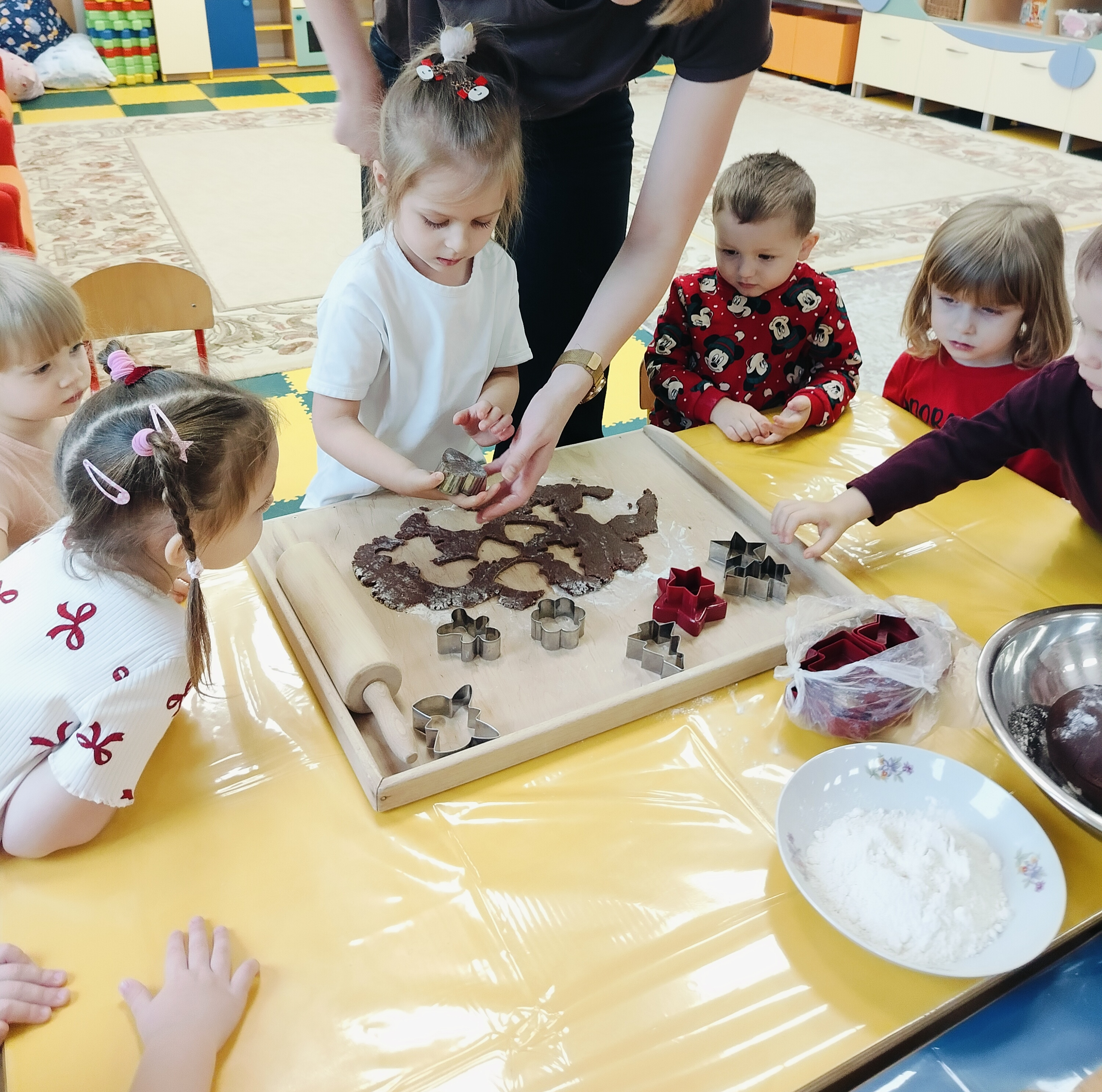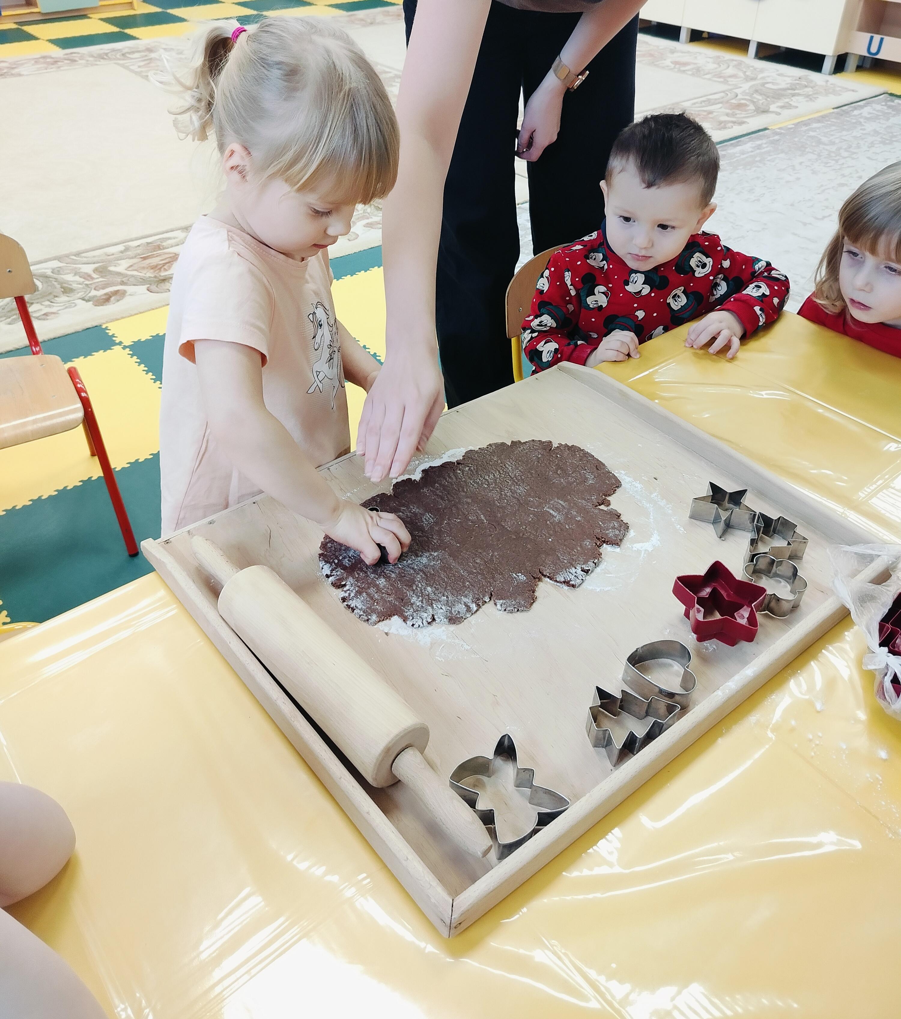 Pieczenie pierniczków to dla naszych przedszkolaków wyjątkowy czas. Dzieci z wielkim zaangażowaniem pracowały przy pachnącym cieście, ugniatając je i wycinając kształty. W całej sali unosił się zapach korzennych przypraw, a w tle słychać było kolędy. To piękna, świąteczna tradycja, która łączy pracę, radość i wspólne przeżywanie świąt.