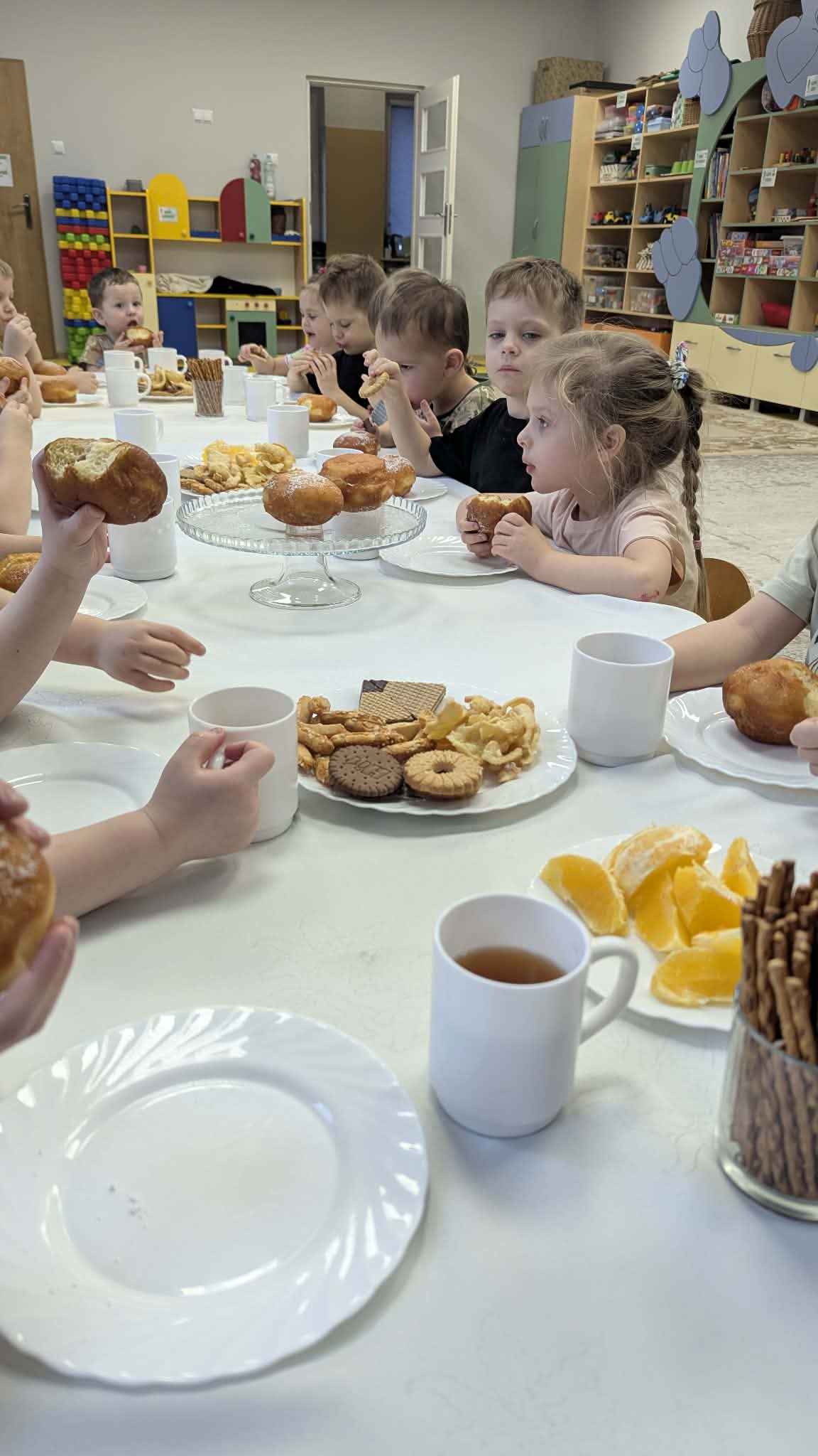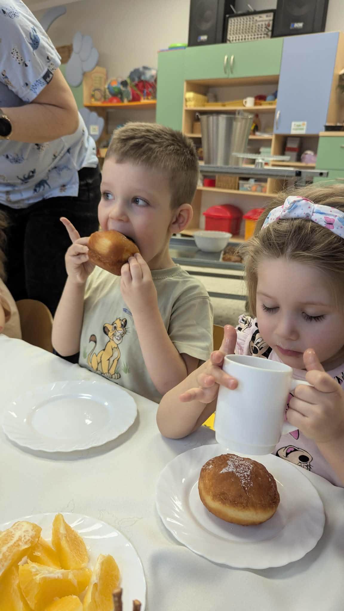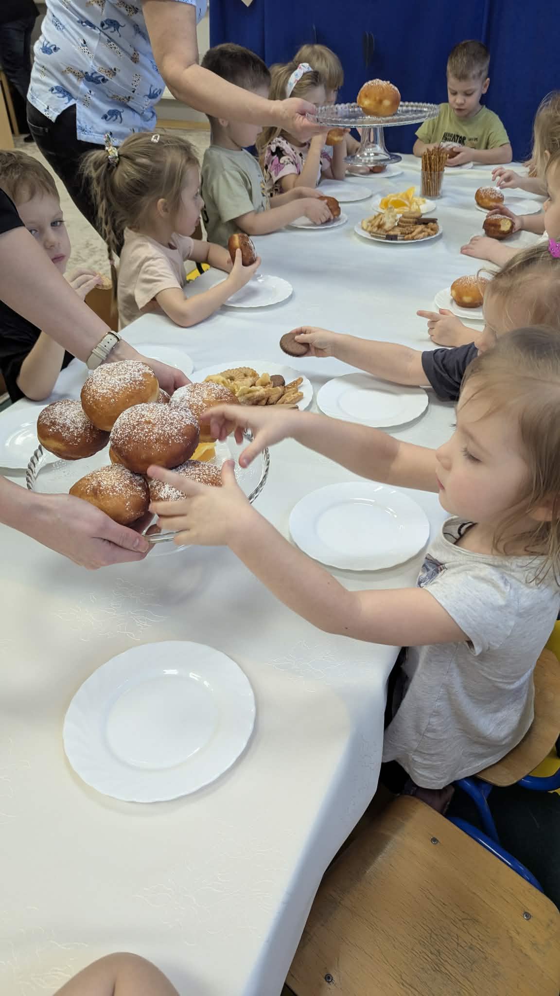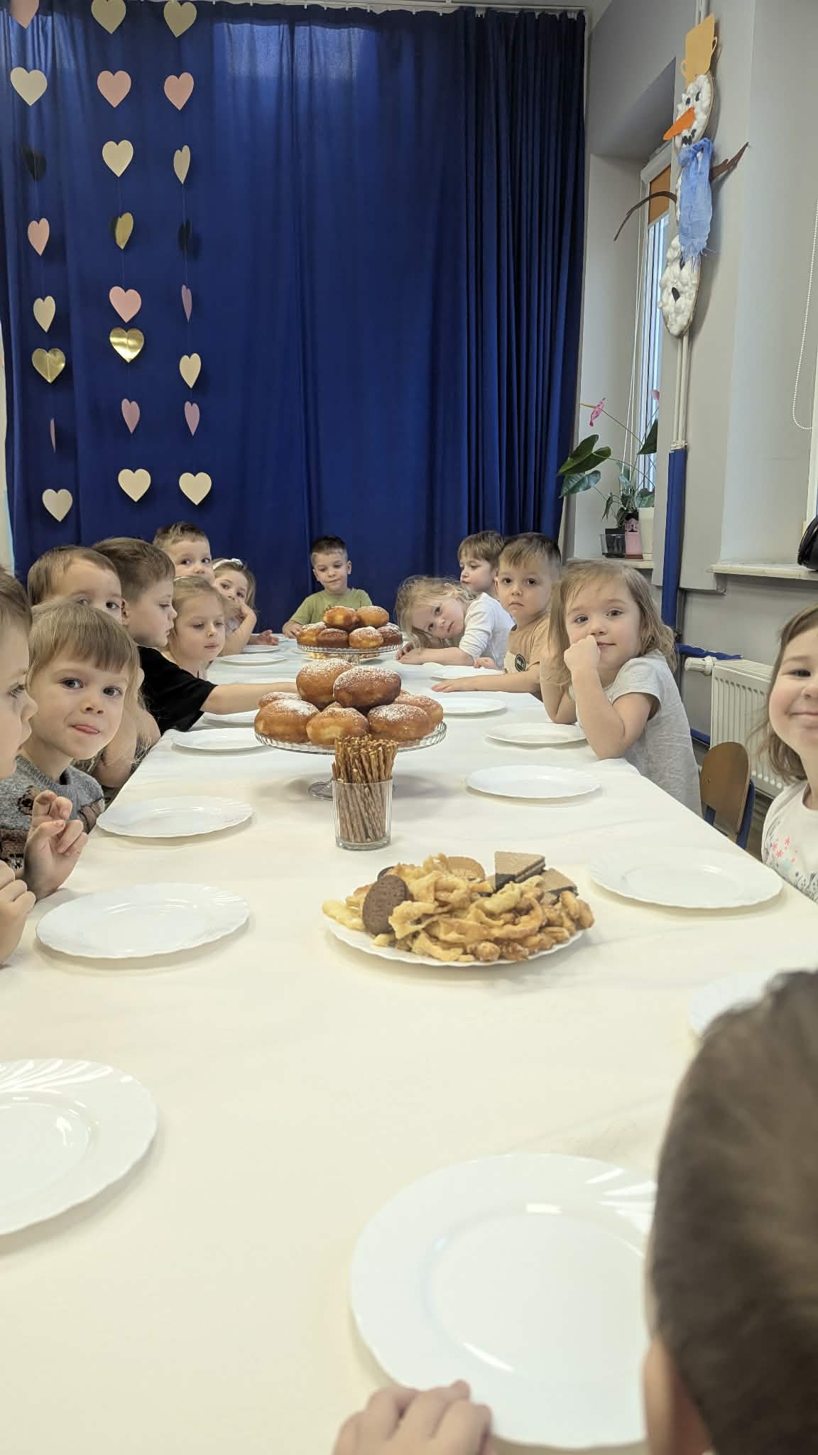 W naszej grupie świętowaliśmy Tłusty Czwartek, poznając jedną z najsłodszych polskich tradycji. Rozmawialiśmy o tym, skąd wziął się zwyczaj jedzenia pączków i innych słodkości oraz dlaczego ten dzień jest tak wyczekiwany w całej Polsce. Podczas zajęć nie zabrakło zabaw tematycznych, rozmów o ulubionych smakach nadzienia oraz prac plastycznych inspirowanych pączkami. Wspólne świętowanie przyniosło wiele radości i uśmiechu, a przy okazji było doskonałą okazją do poznawania polskich tradycji w miłej, słodkiej atmosferze.