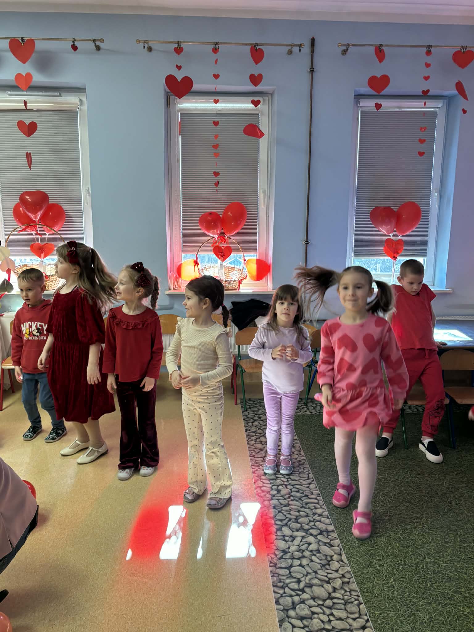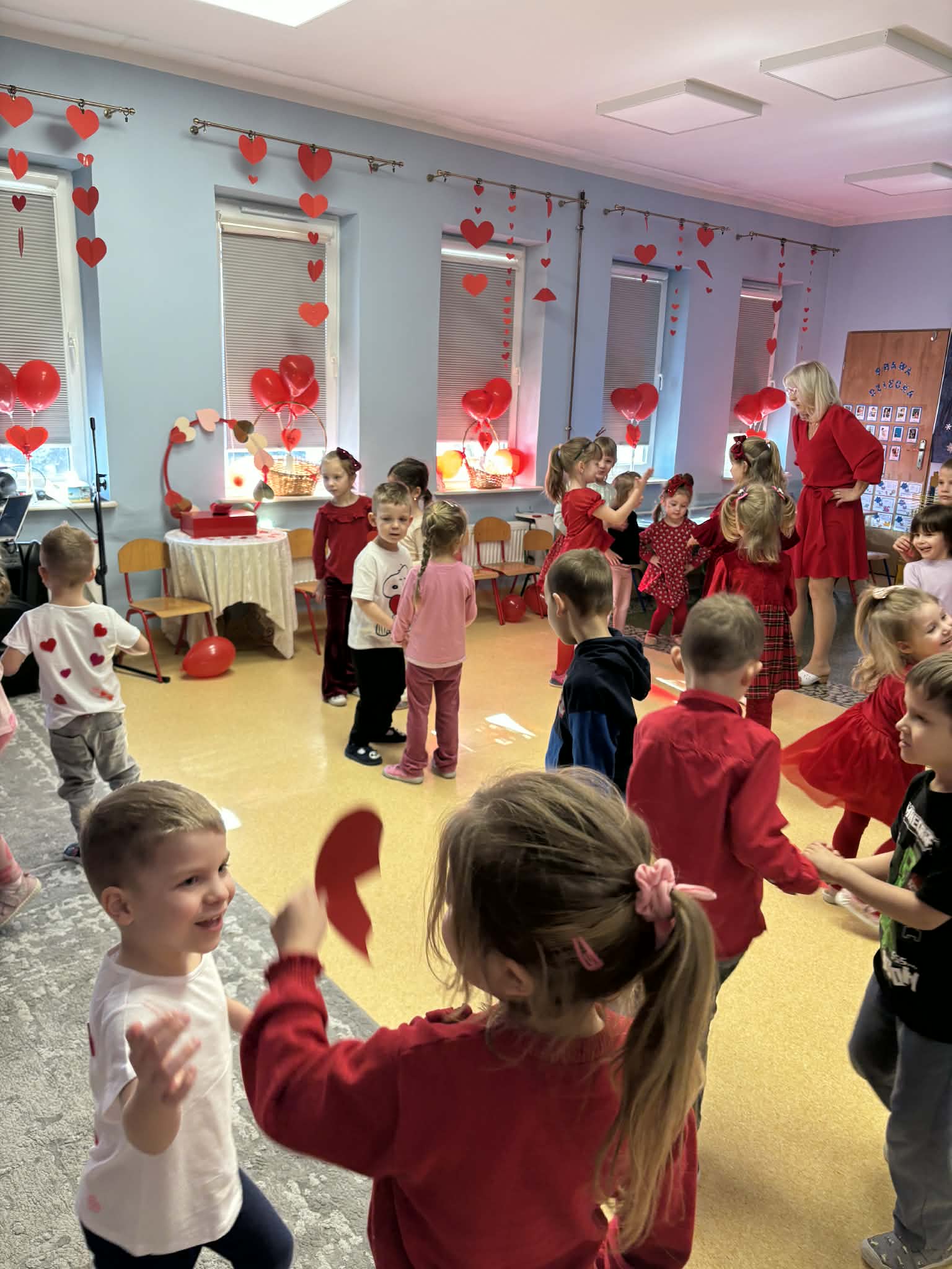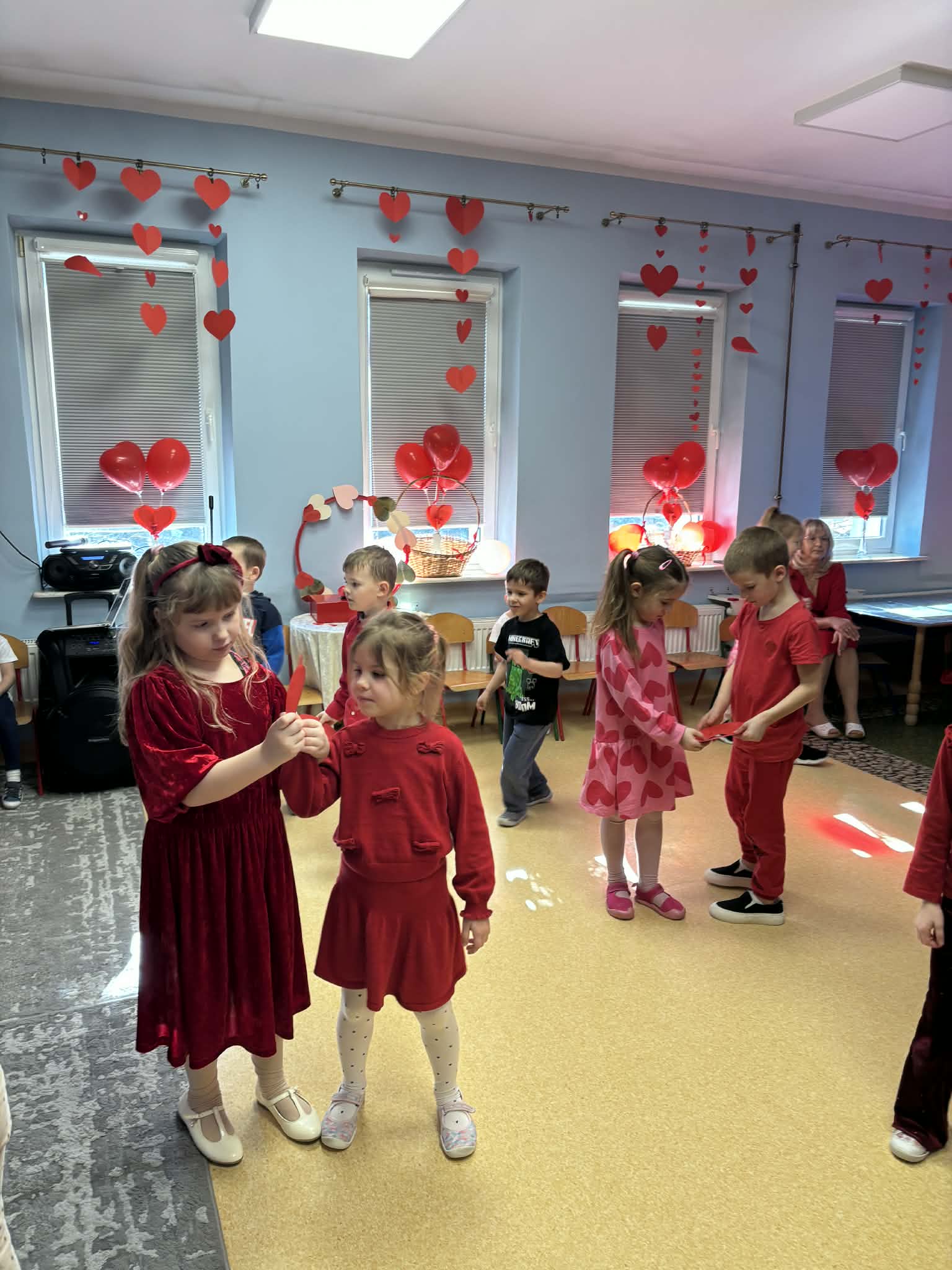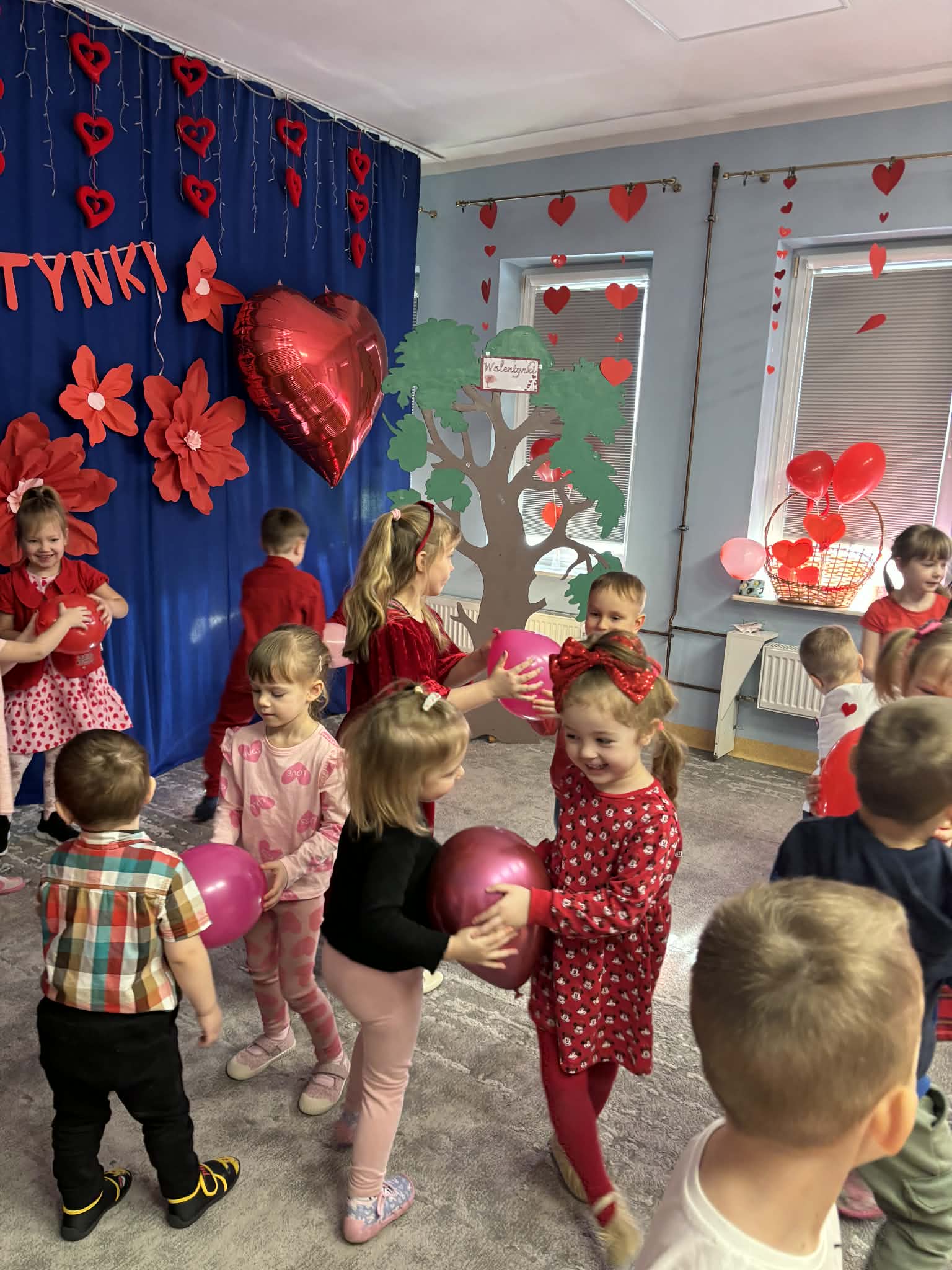 W dniu św. Walentego panował wyjątkowy nastrój. W przedszkolu królował kolor czerwony. Dzieci wysłuchały historię o św. Walentym, poznały tradycje walentynkowe. Dowiedziały się jak ważne jest okazywanie uczuć przyjaźni i sympatii w stosunku do innych ludzi. Poznały słowo kocham w różnych językach, prawiły sobie komplementy i mówiły miłe słowa oraz mówiły, co według nich znaczy kochać kogoś i jak można to pokazać drugiej osobie. Dzieci, ubrane w czerwone stroje z sercowymi elementami, wzięły udział w różnych zabawach związanych z walentynkami m.in.: szukały drugiej połówki serca, brały udział w zabawach ruchowych z balonami. Następnie wyklejały, rysowały i kolorowały serduszka, wykonywały prace plastyczne i laurki, by następnie wręczyć je jako walentynkę swoim najbliższym.