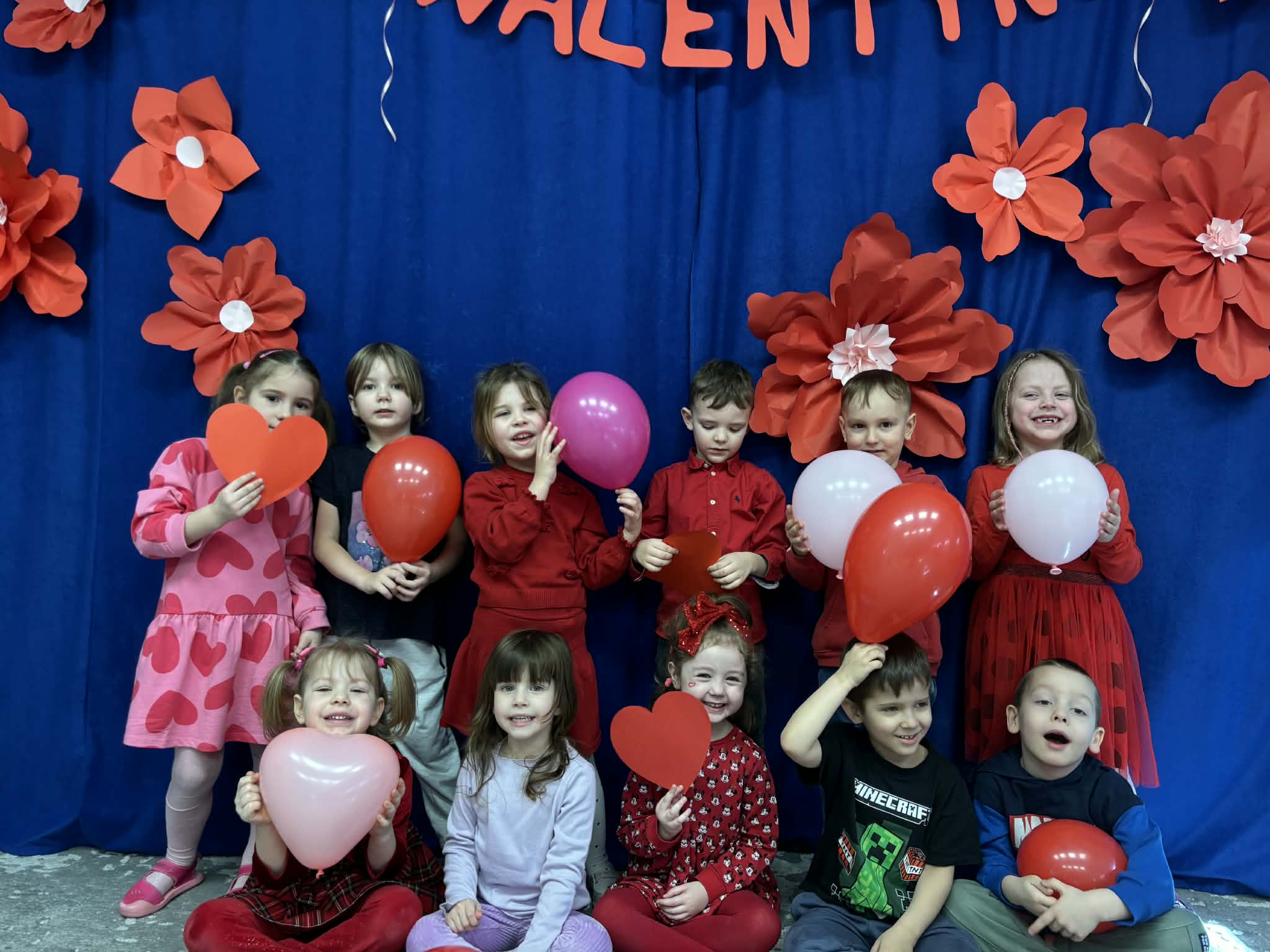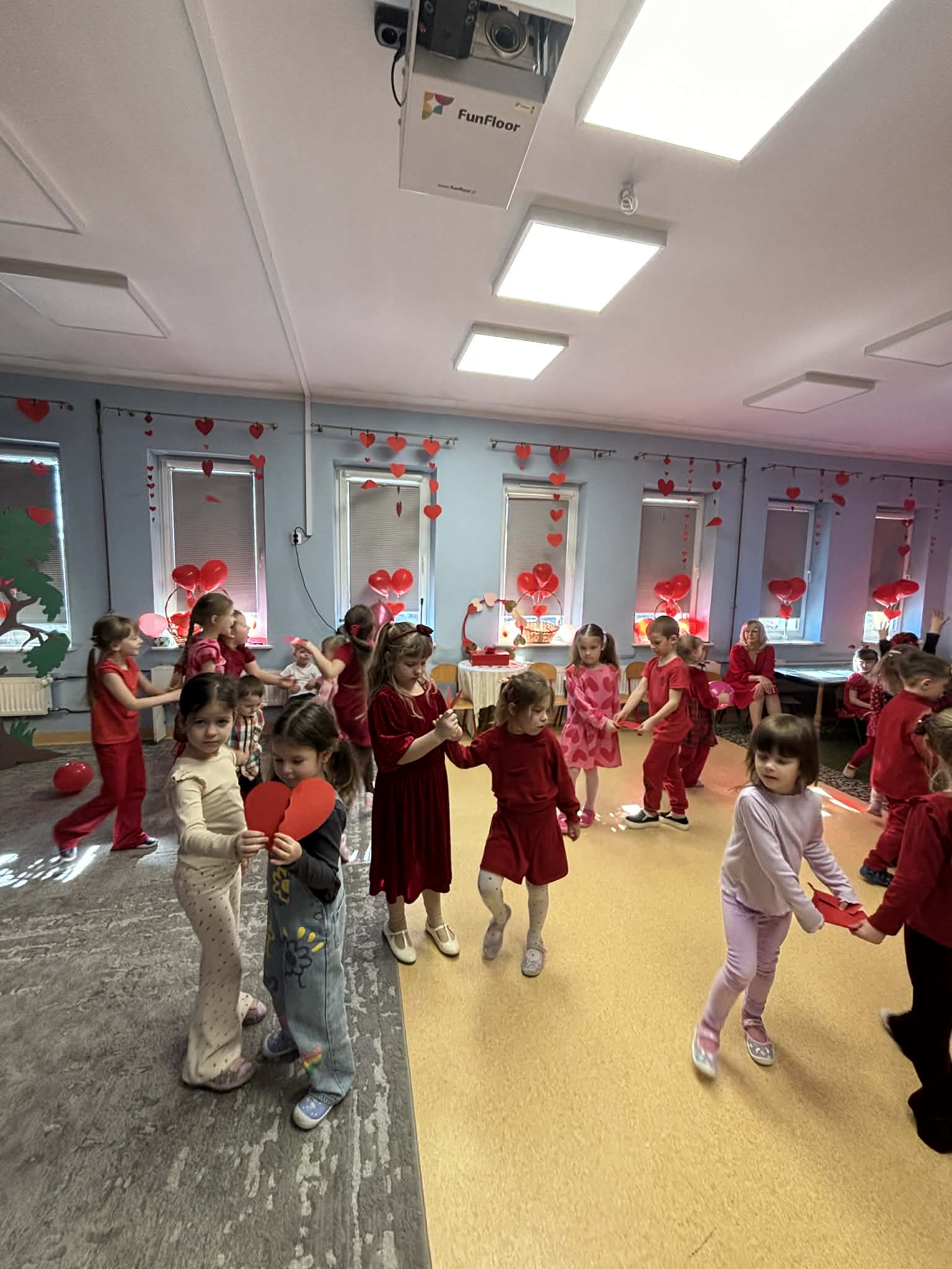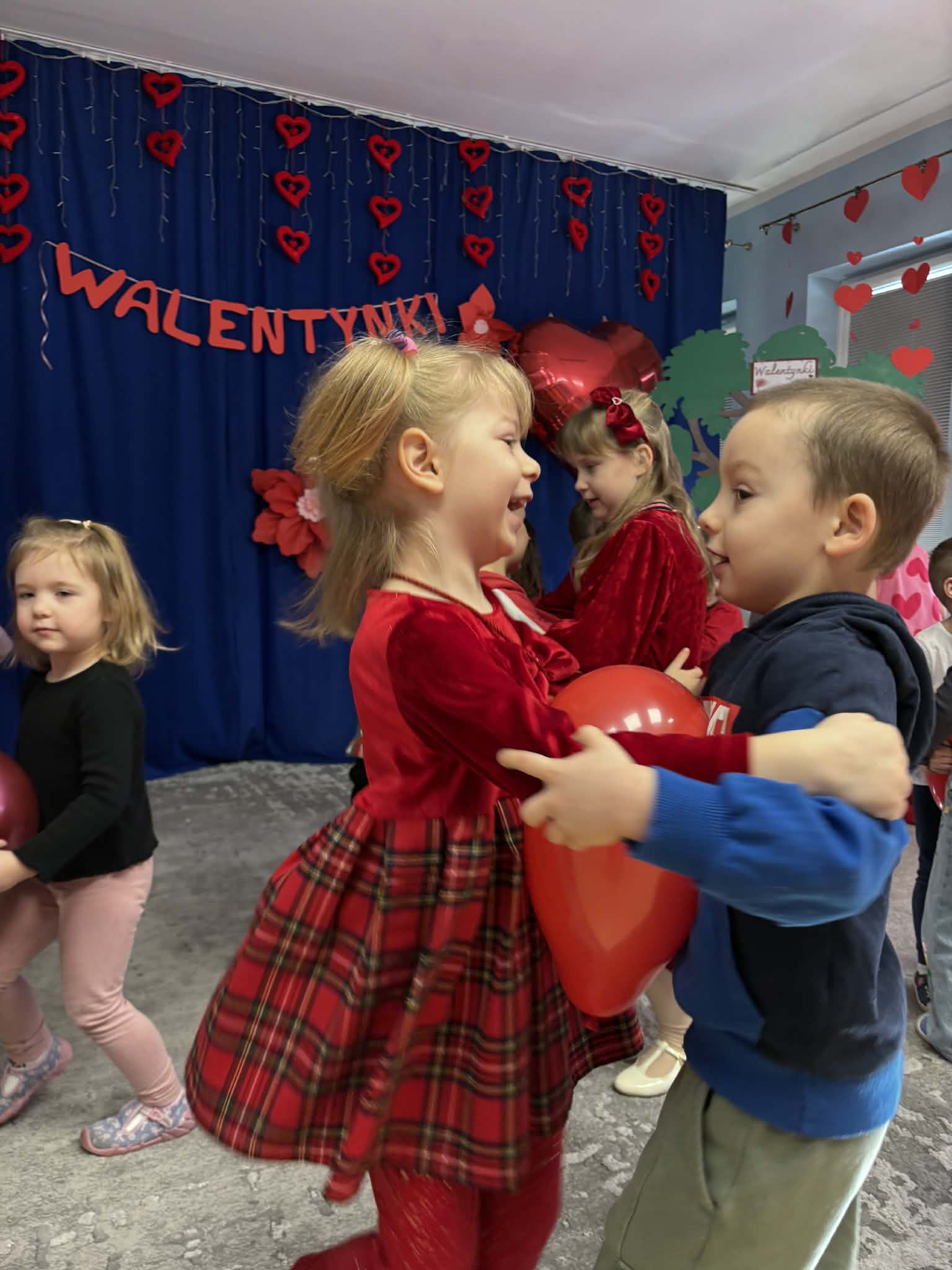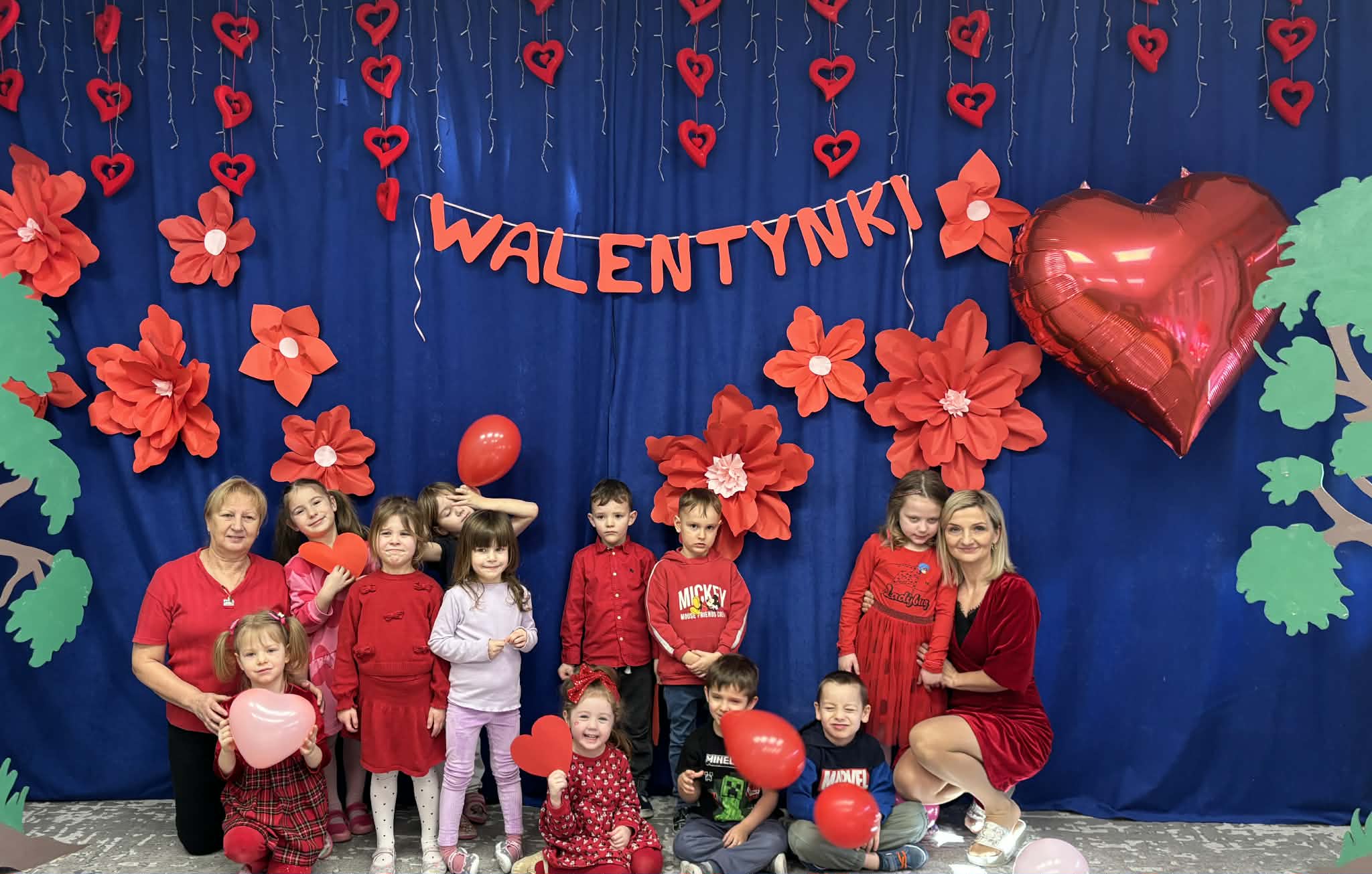 W dniu św. Walentego panował wyjątkowy nastrój. W przedszkolu królował kolor czerwony. Dzieci wysłuchały historię o św. Walentym, poznały tradycje walentynkowe. Dowiedziały się jak ważne jest okazywanie uczuć przyjaźni i sympatii w stosunku do innych ludzi. Poznały słowo kocham w różnych językach, prawiły sobie komplementy i mówiły miłe słowa oraz mówiły, co według nich znaczy kochać kogoś i jak można to pokazać drugiej osobie. Dzieci, ubrane w czerwone stroje z sercowymi elementami, wzięły udział w różnych zabawach związanych z walentynkami m.in.: szukały drugiej połówki serca, brały udział w zabawach ruchowych z balonami. Następnie wyklejały, rysowały i kolorowały serduszka, wykonywały prace plastyczne i laurki, by następnie wręczyć je jako walentynkę swoim najbliższym.