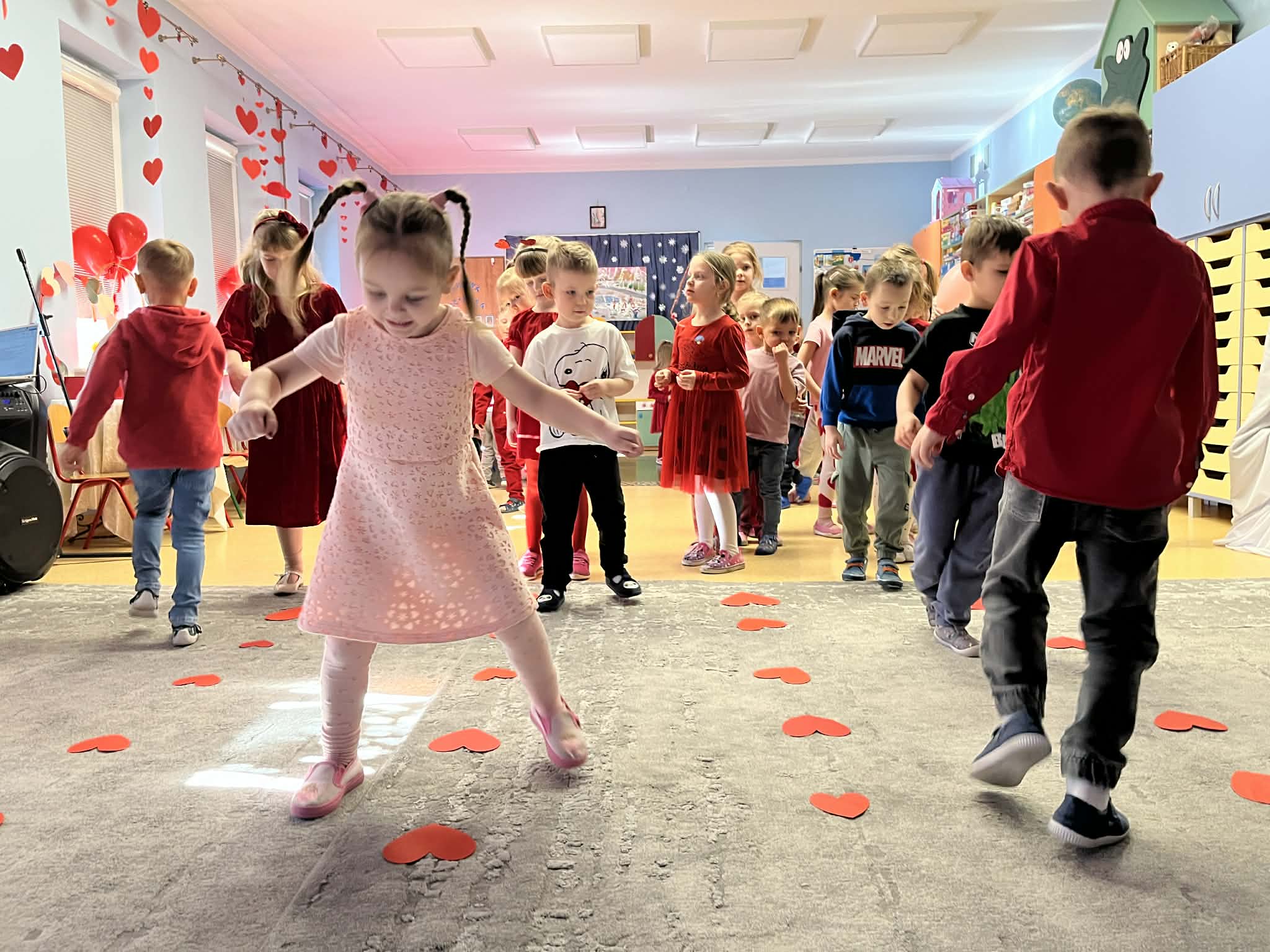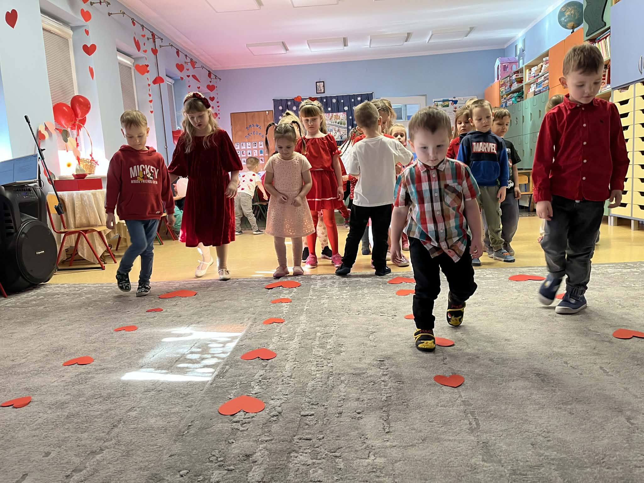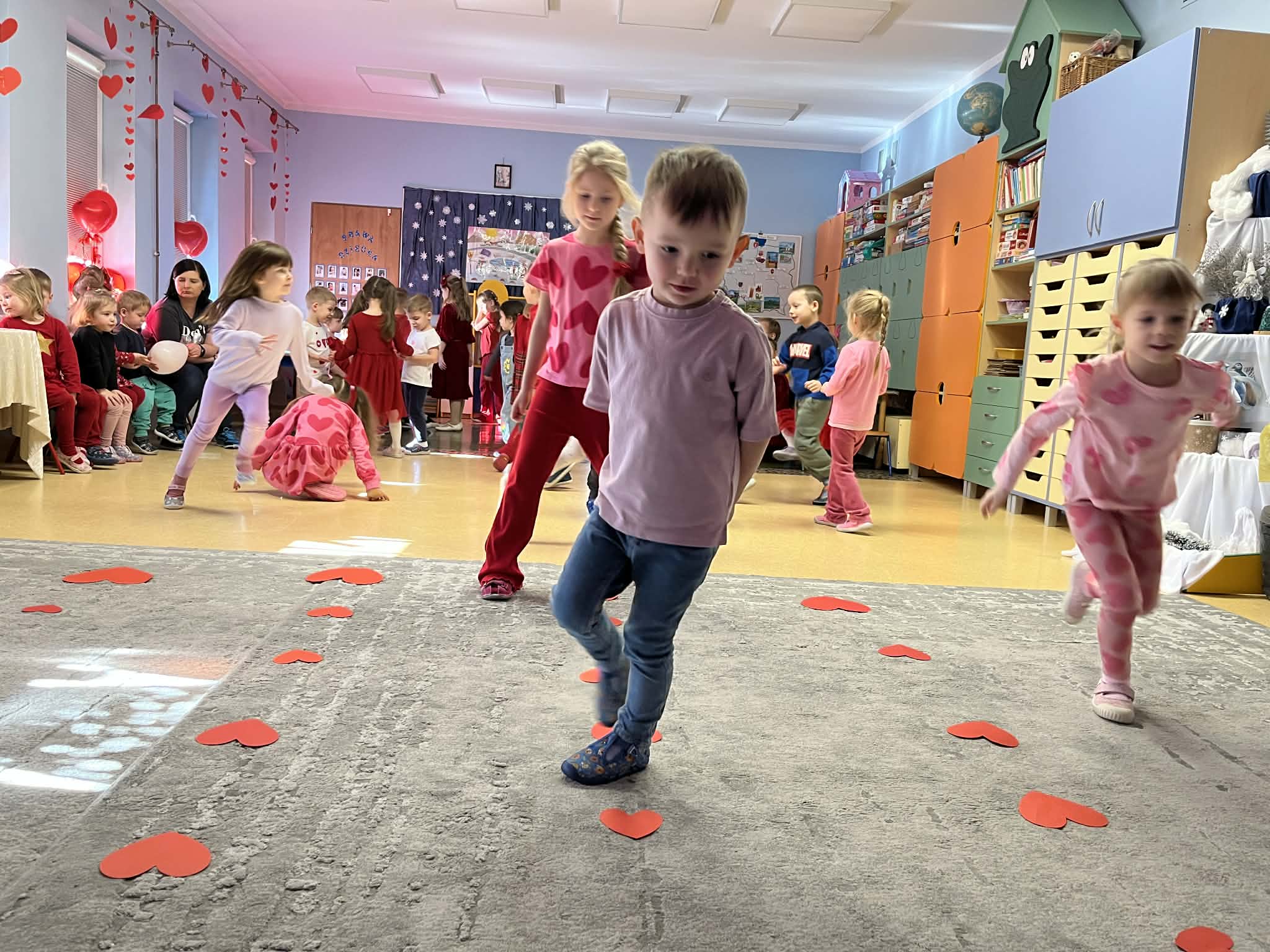 Walentynki w przedszkolu to wyjątkowy czas pełen radości i okazja do rozmów o tym, jak ważna jest przyjaźń oraz okazywanie sobie życzliwości. Tego dnia kolor czerwony i serduszka były obecne wszędzie, tworząc ciepłą i serdeczną atmosferę. Podczas balu walentynkowego nie zabrakło wspaniałej zabawy – dzieci tańczyły w parach, bawiły się z serduszkami, dopasowywały połówki serc oraz wykonywały różnorodne zadania ruchowe. Było dużo śmiechu, współpracy i wspólnej radości. W wolnej chwili wykonaliśmy także zadanie doskonalące motorykę małą, rozwijając sprawność dłoni i palców. To był dzień pełen uśmiechu, serdeczności i wspólnej zabawy.