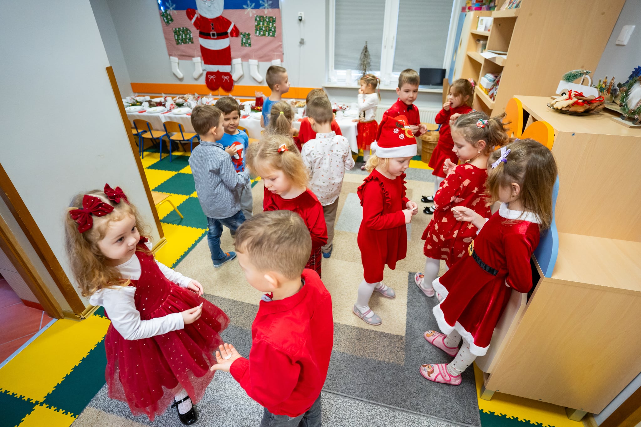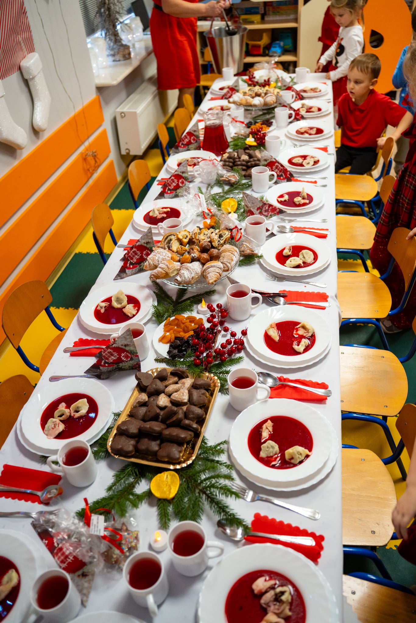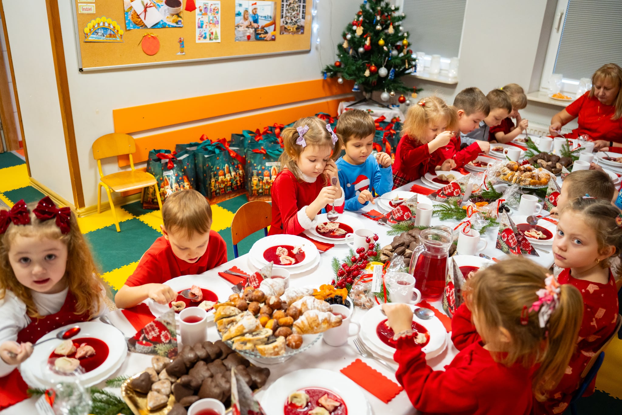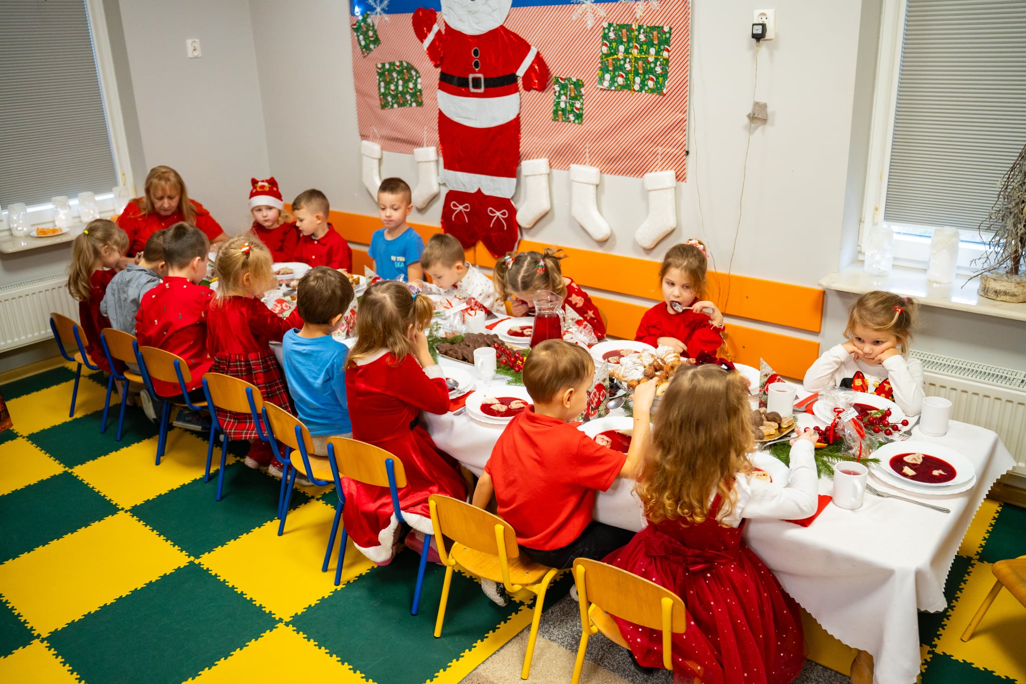 Zwyczaj ten przed kilkoma laty wpisał się do przedszkolnego kalendarza i jest celebrowany w podniosłej, rodzinnej atmosferze z należytą oprawą, przynależną temu świętu. Zaczęliśmy zgodnie zchrześcijańskimobyczajem. Dyrektorprzedszkola Jolanta Skolimowska przeczytałafragment Ewangelii św. Łukasza (Łk 2, 1–14 )opisujący narodzenie Jezusa w Betlejem, po czym dzieliliśmy sięopłatkiem, składaliśmysobie na wzajem z dziećmi życzenia.W eter popłynęły kolędy, pastorałki i kołysanki dla Jezusa. Zjedliśmy obiad na kształt wigilijnej wieczerzy. Dzieci zasiadły przy suto zastawionych stołach nakrytych śnieżnobiałymi obrusami. Wśród wielu potraw królował czerwony barszczyk z uszkami przygotowanymi przez panie z przedszkolnej kuchni, które„ kręcącsię jakw ukropie” dosłownie i w przenośni,zdążyły ze wszystkim na czas, zrobiły ich chyba ze 300 sztuk, była ryba (nie karp, ale równie smaczna ). Jak obyczaj stary każe na stołach pojawiły się słodycze do których dobrały się dzieciaki. „To nasz wspaniały dzień w przedszkolu”radowały się przedszkolakizjadając własnoręcznie wykonane pierniki,ciasto, suszone owoce. Swoje pięć minut miał też Święty Mikołaj na którego przyjście czekały dzieci.W świątecznym nastroju spędziliśmy czas oczekiwania narodzin Jezusa.