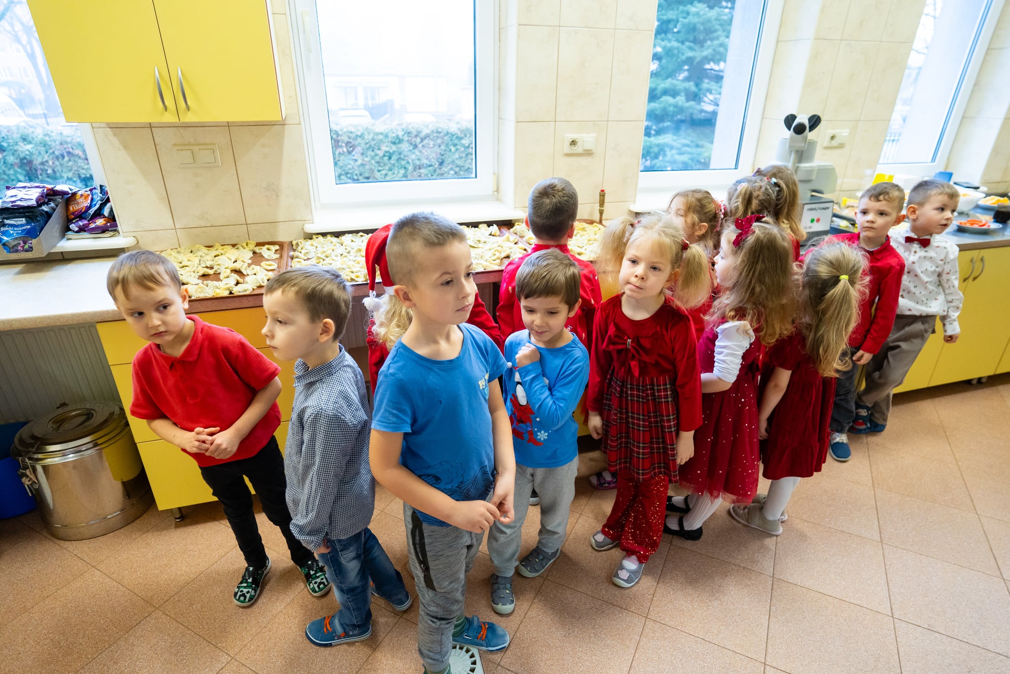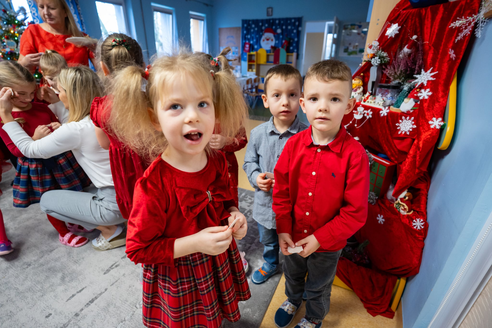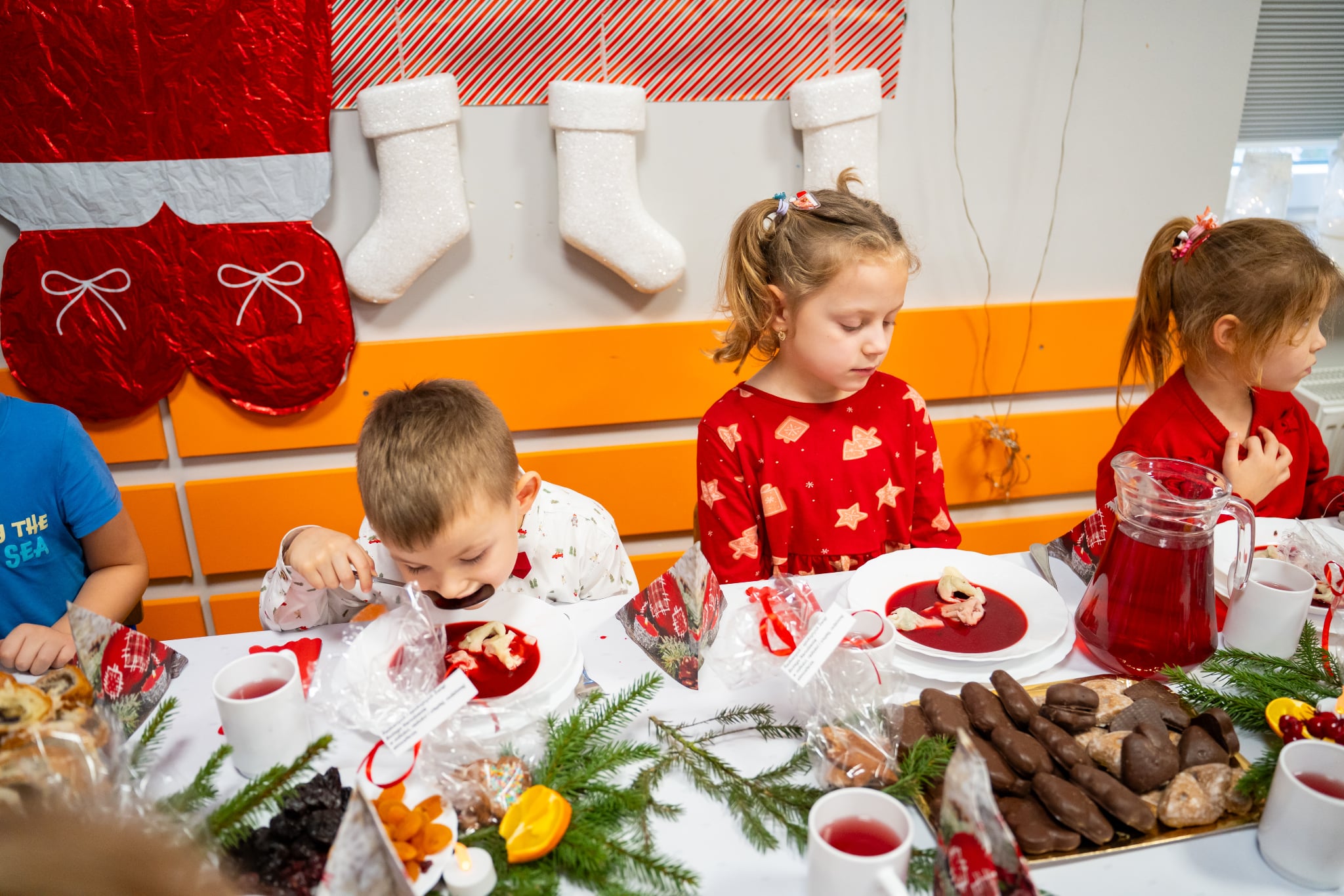 Zwyczaj ten przed kilkoma laty wpisał się do przedszkolnego kalendarza i jest celebrowany w podniosłej, rodzinnej atmosferze z należytą oprawą, przynależną temu świętu. Zaczęliśmy zgodnie zchrześcijańskimobyczajem. Dyrektorprzedszkola Jolanta Skolimowska przeczytałafragment Ewangelii św. Łukasza (Łk 2, 1–14 )opisujący narodzenie Jezusa w Betlejem, po czym dzieliliśmy sięopłatkiem, składaliśmysobie na wzajem z dziećmi życzenia.W eter popłynęły kolędy, pastorałki i kołysanki dla Jezusa. Zjedliśmy obiad na kształt wigilijnej wieczerzy. Dzieci zasiadły przy suto zastawionych stołach nakrytych śnieżnobiałymi obrusami. Wśród wielu potraw królował czerwony barszczyk z uszkami przygotowanymi przez panie z przedszkolnej kuchni, które„ kręcącsię jakw ukropie” dosłownie i w przenośni,zdążyły ze wszystkim na czas, zrobiły ich chyba ze 300 sztuk, była ryba (nie karp, ale równie smaczna ). Jak obyczaj stary każe na stołach pojawiły się słodycze do których dobrały się dzieciaki. „To nasz wspaniały dzień w przedszkolu”radowały się przedszkolakizjadając własnoręcznie wykonane pierniki,ciasto, suszone owoce. Swoje pięć minut miał też Święty Mikołaj na którego przyjście czekały dzieci.W świątecznym nastroju spędziliśmy czas oczekiwania narodzin Jezusa.