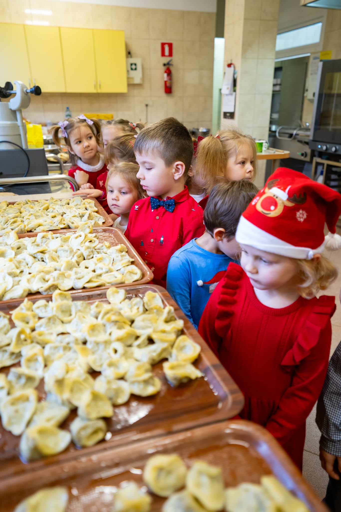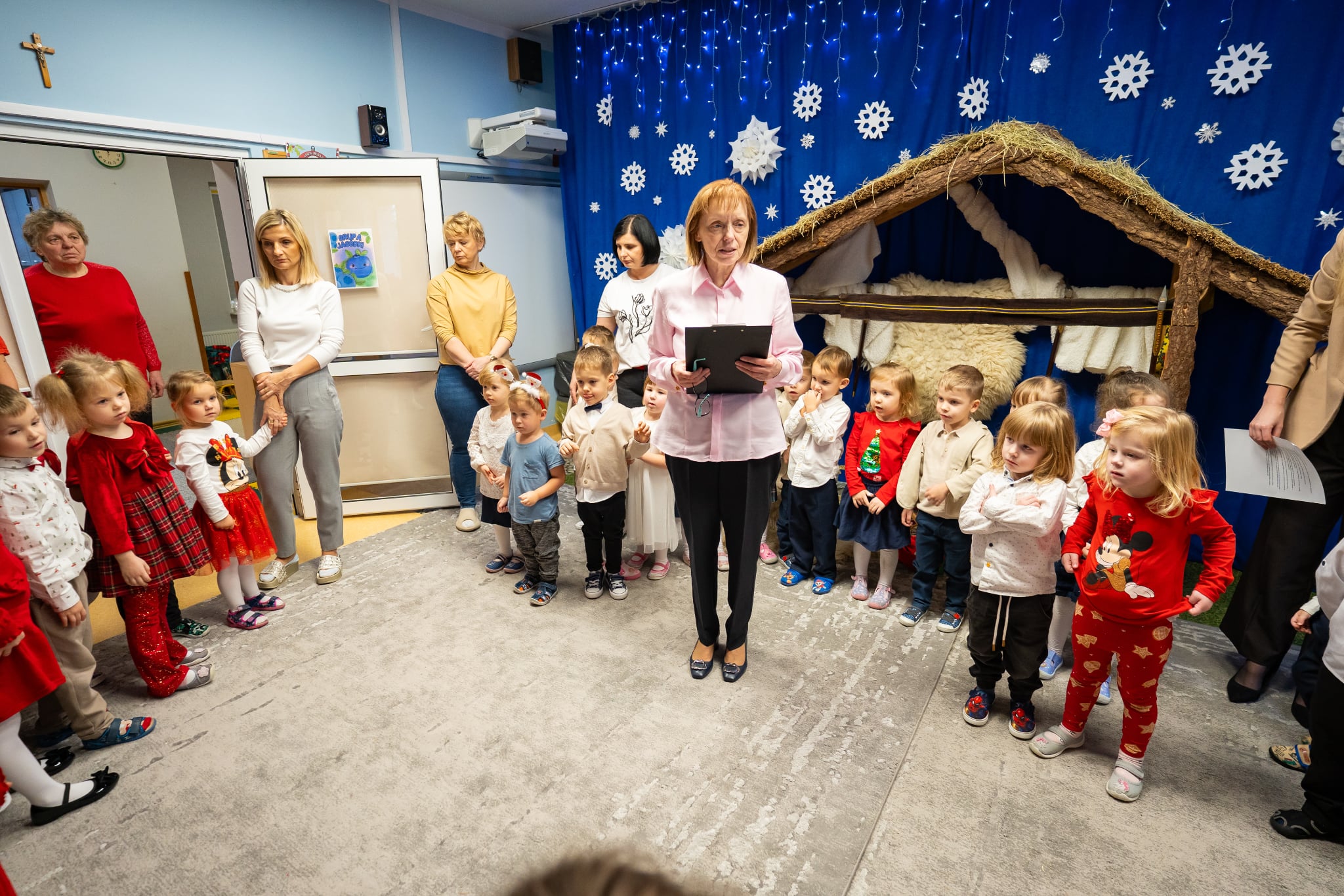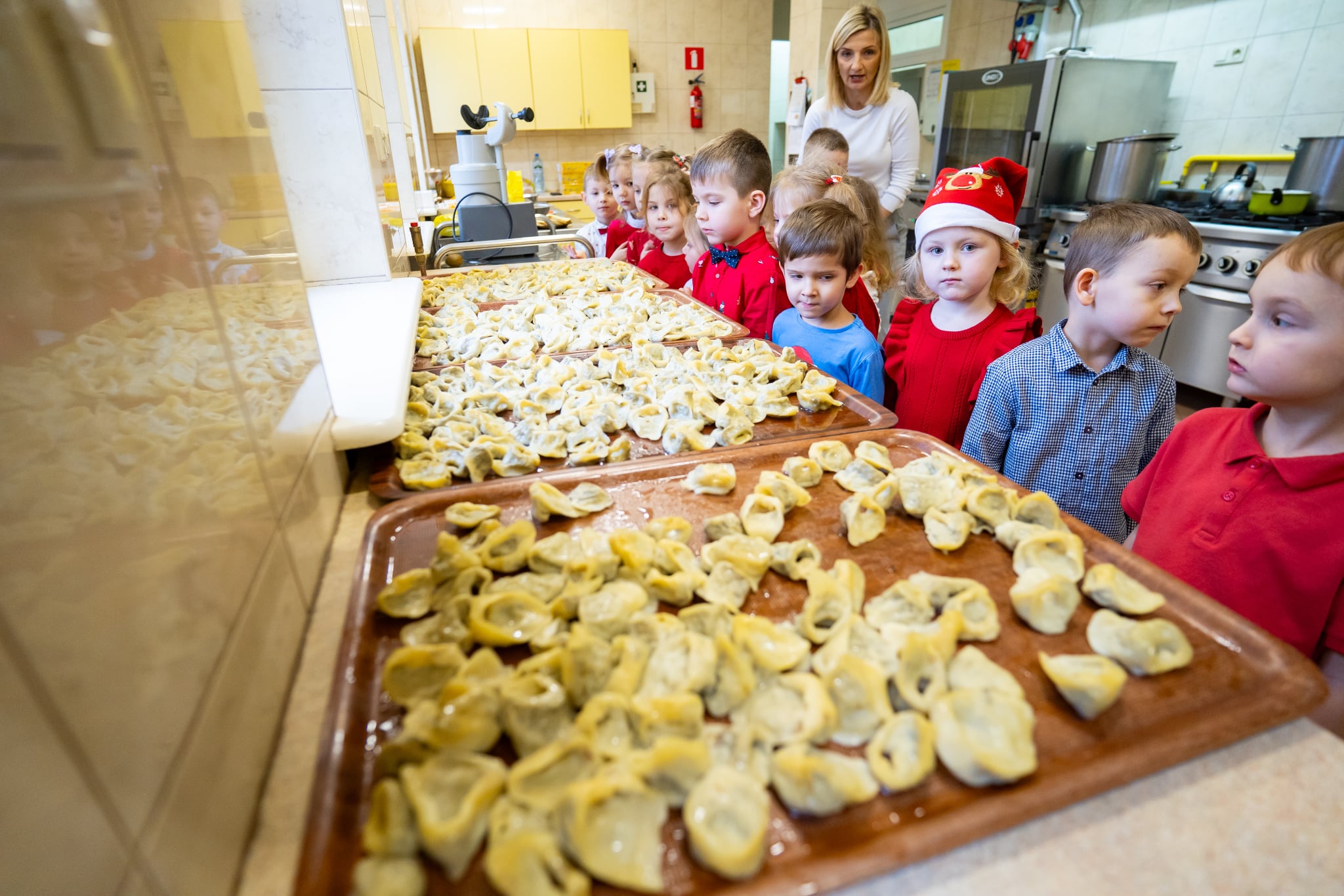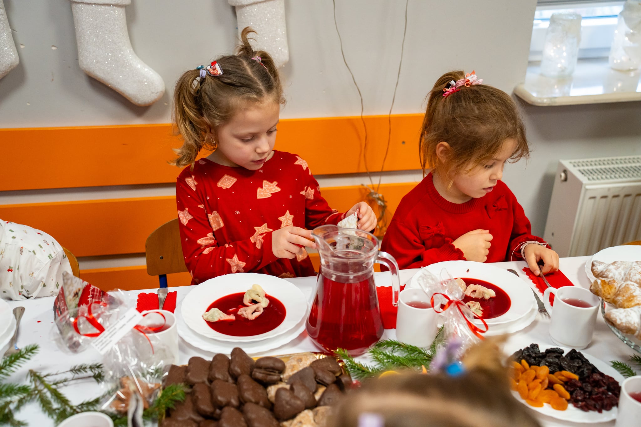 Zwyczaj ten przed kilkoma laty wpisał się do przedszkolnego kalendarza i jest celebrowany w podniosłej, rodzinnej atmosferze z należytą oprawą, przynależną temu świętu. Zaczęliśmy zgodnie zchrześcijańskimobyczajem. Dyrektorprzedszkola Jolanta Skolimowska przeczytałafragment Ewangelii św. Łukasza (Łk 2, 1–14 )opisujący narodzenie Jezusa w Betlejem, po czym dzieliliśmy sięopłatkiem, składaliśmysobie na wzajem z dziećmi życzenia.W eter popłynęły kolędy, pastorałki i kołysanki dla Jezusa. Zjedliśmy obiad na kształt wigilijnej wieczerzy. Dzieci zasiadły przy suto zastawionych stołach nakrytych śnieżnobiałymi obrusami. Wśród wielu potraw królował czerwony barszczyk z uszkami przygotowanymi przez panie z przedszkolnej kuchni, które„ kręcącsię jakw ukropie” dosłownie i w przenośni,zdążyły ze wszystkim na czas, zrobiły ich chyba ze 300 sztuk, była ryba (nie karp, ale równie smaczna ). Jak obyczaj stary każe na stołach pojawiły się słodycze do których dobrały się dzieciaki. „To nasz wspaniały dzień w przedszkolu”radowały się przedszkolakizjadając własnoręcznie wykonane pierniki,ciasto, suszone owoce. Swoje pięć minut miał też Święty Mikołaj na którego przyjście czekały dzieci.W świątecznym nastroju spędziliśmy czas oczekiwania narodzin Jezusa.