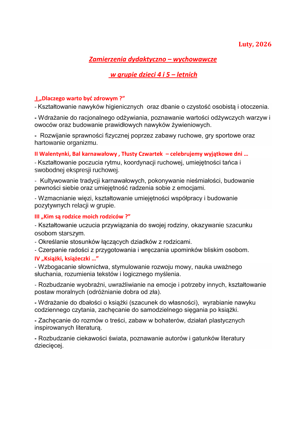 ZAMIERZENIA DYDAKTYCZNO-WYCHOWAWCZE NA MIESIĄC LUTY
