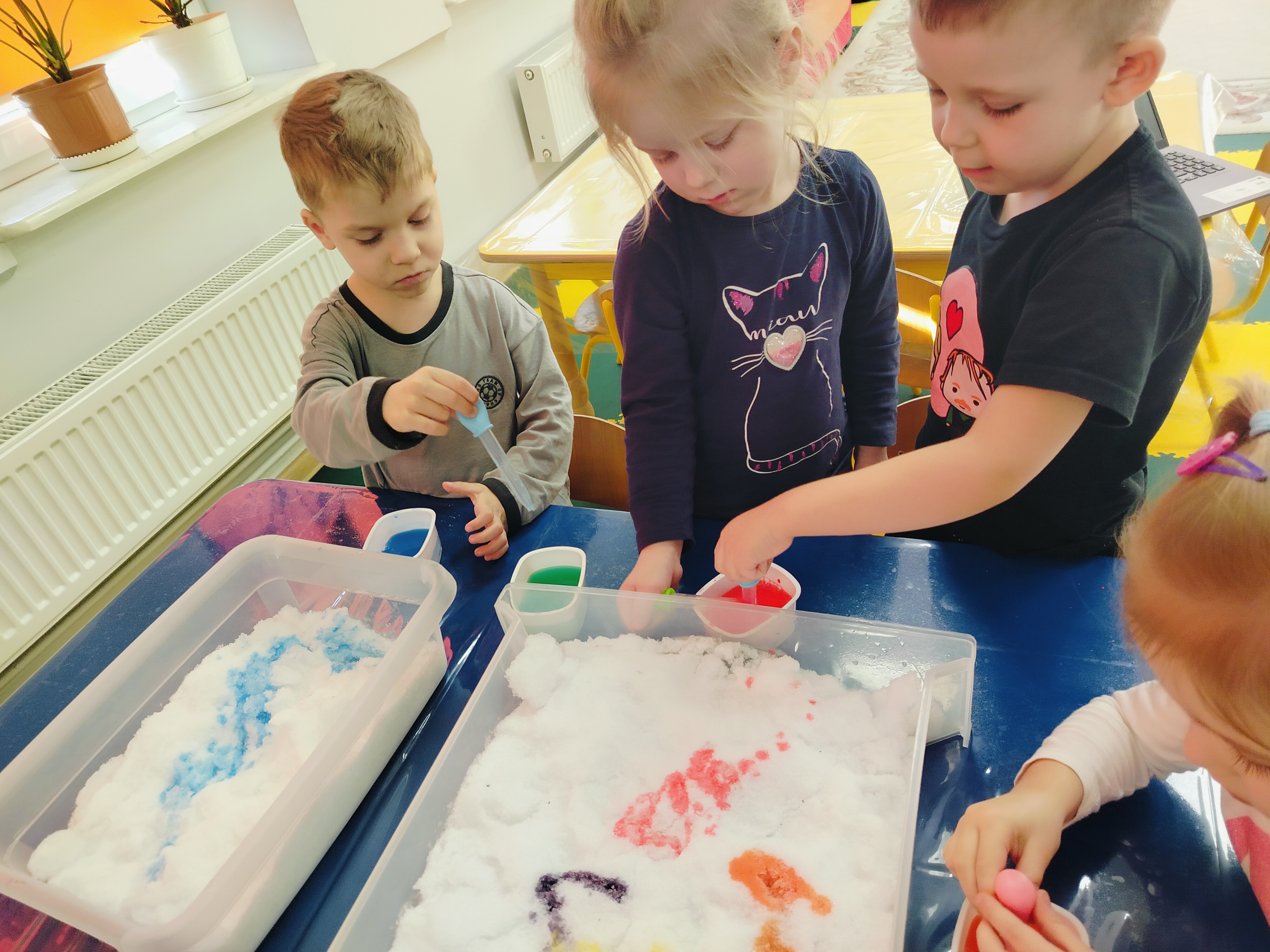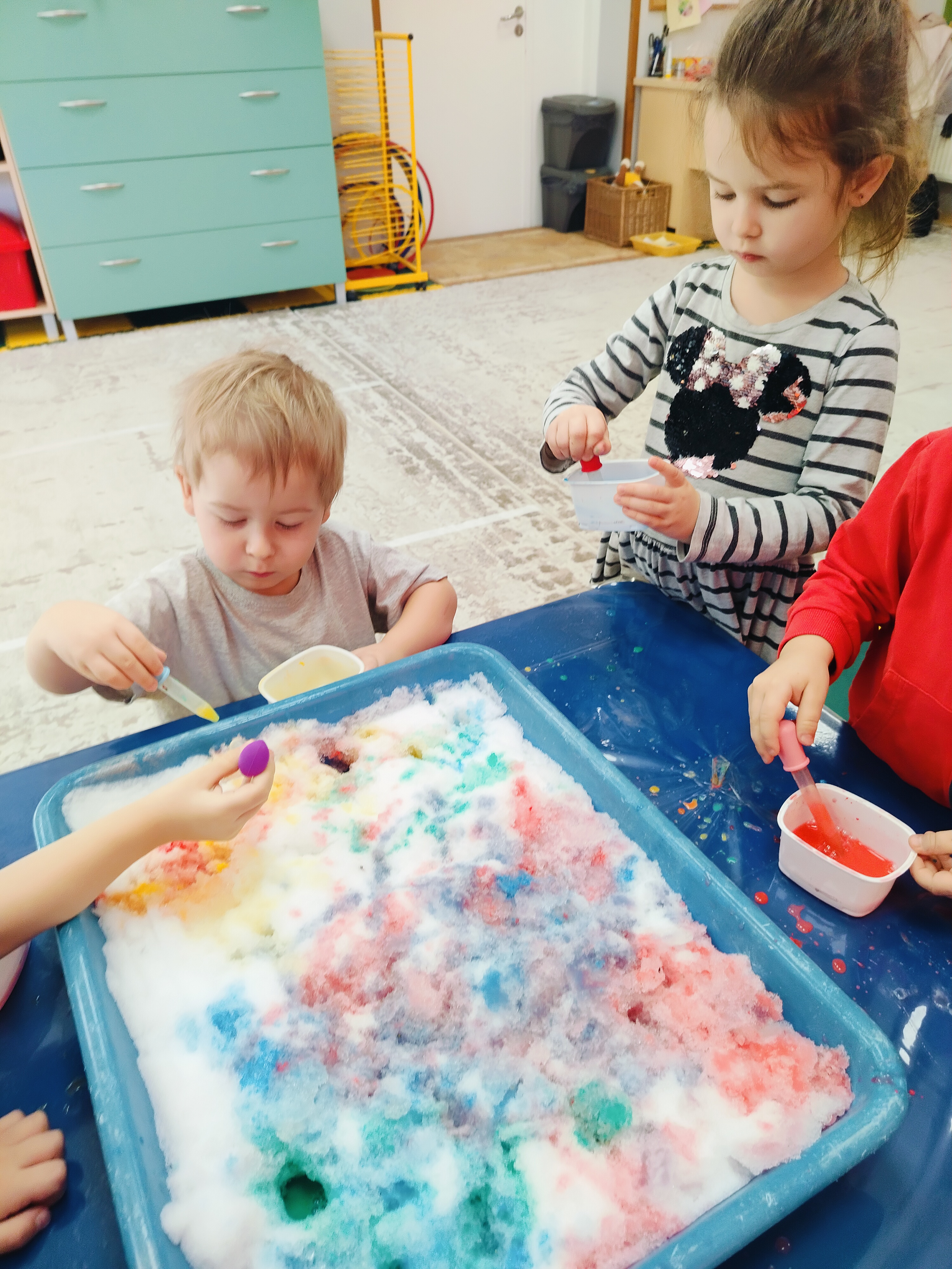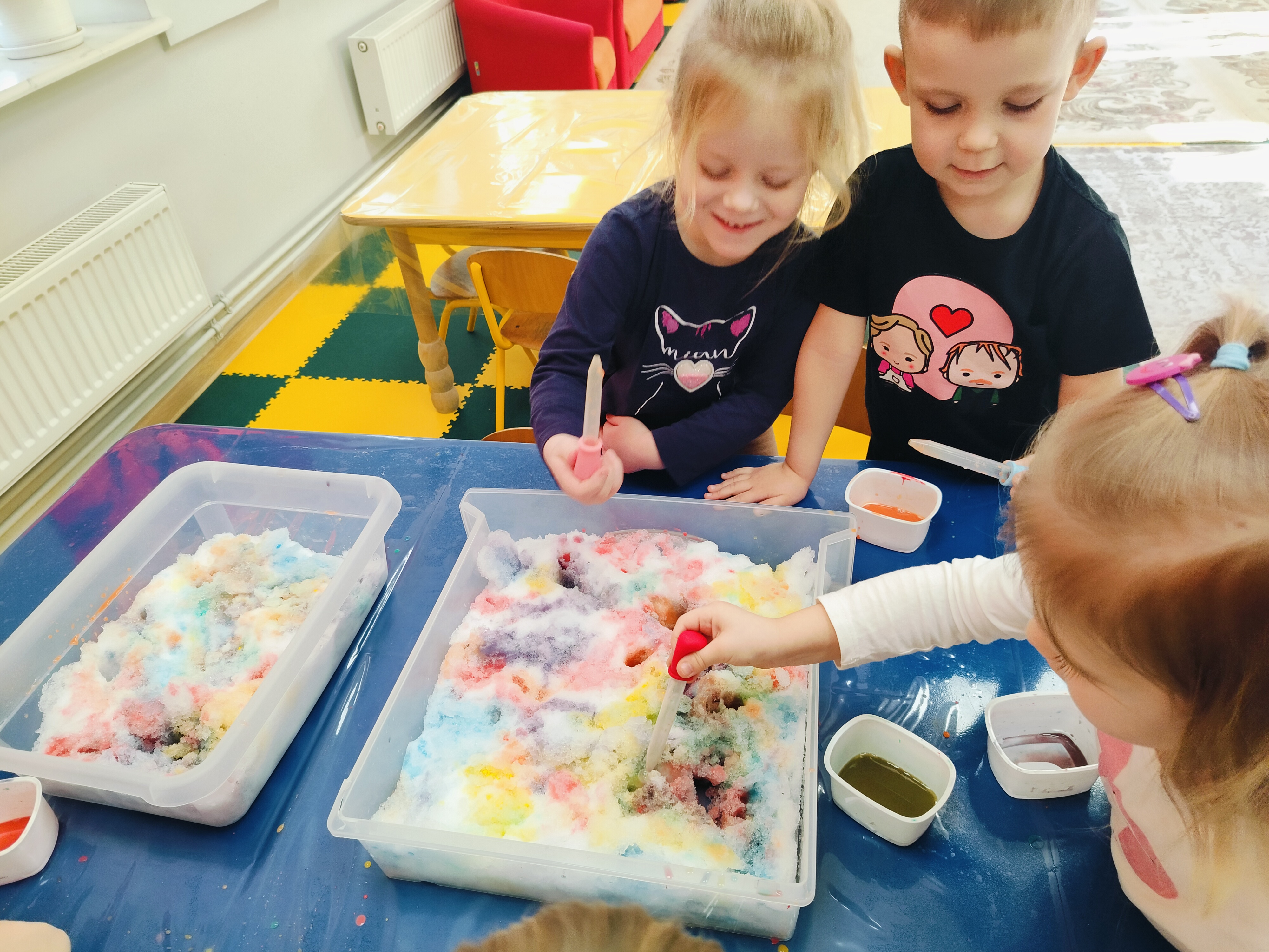 Dziś w naszym przedszkolu pudełko wypełnione śniegiem zamieniło się w prawdziwe płótno. Malowaliśmy po nim wodą z dodatkiem farb, obserwując jak kolory rozlewają się i tworzą niezwykłe wzory. To było nie tylko kreatywne, ale też bardzo ciekawe doświadczenie sensoryczne.
