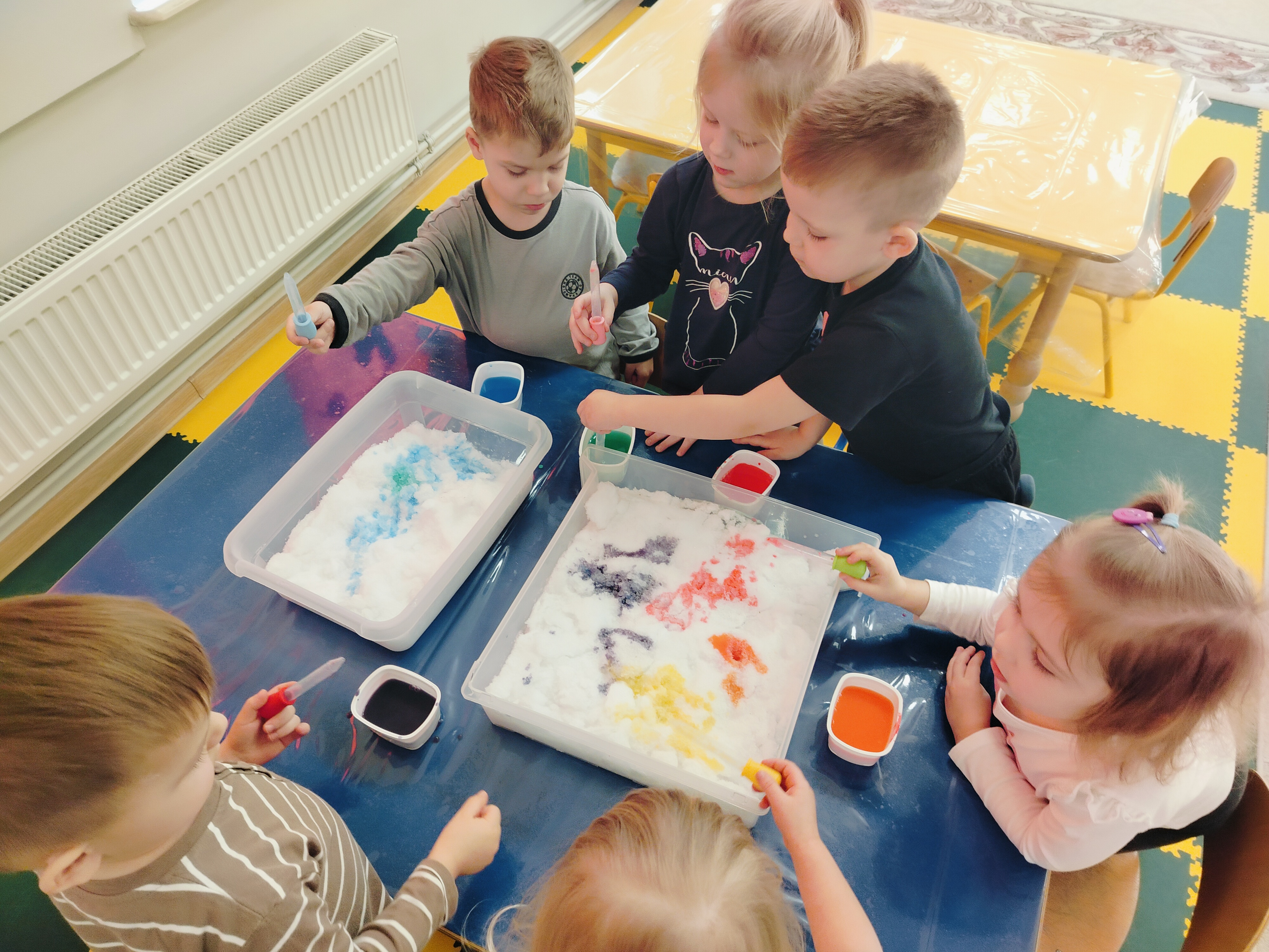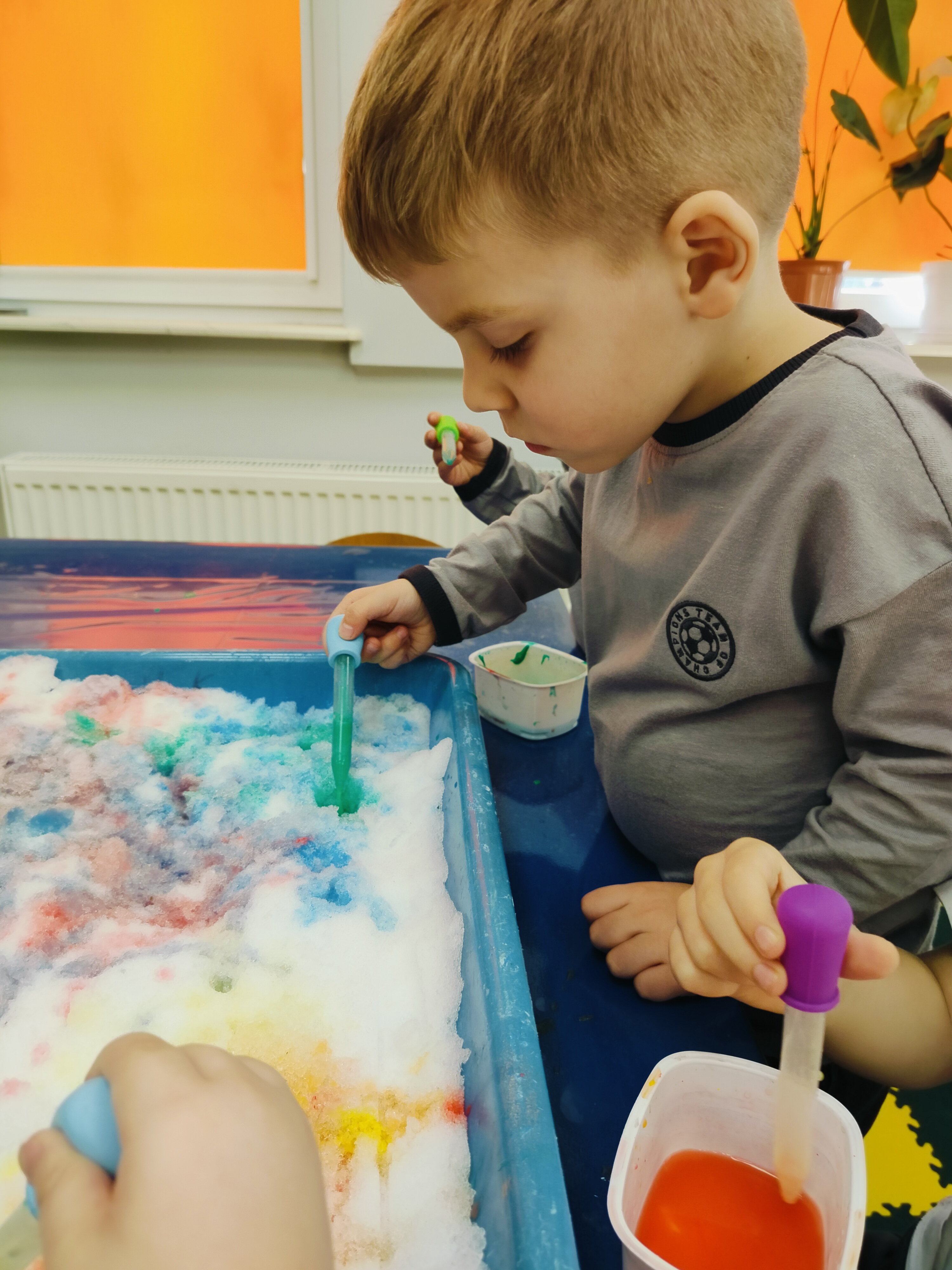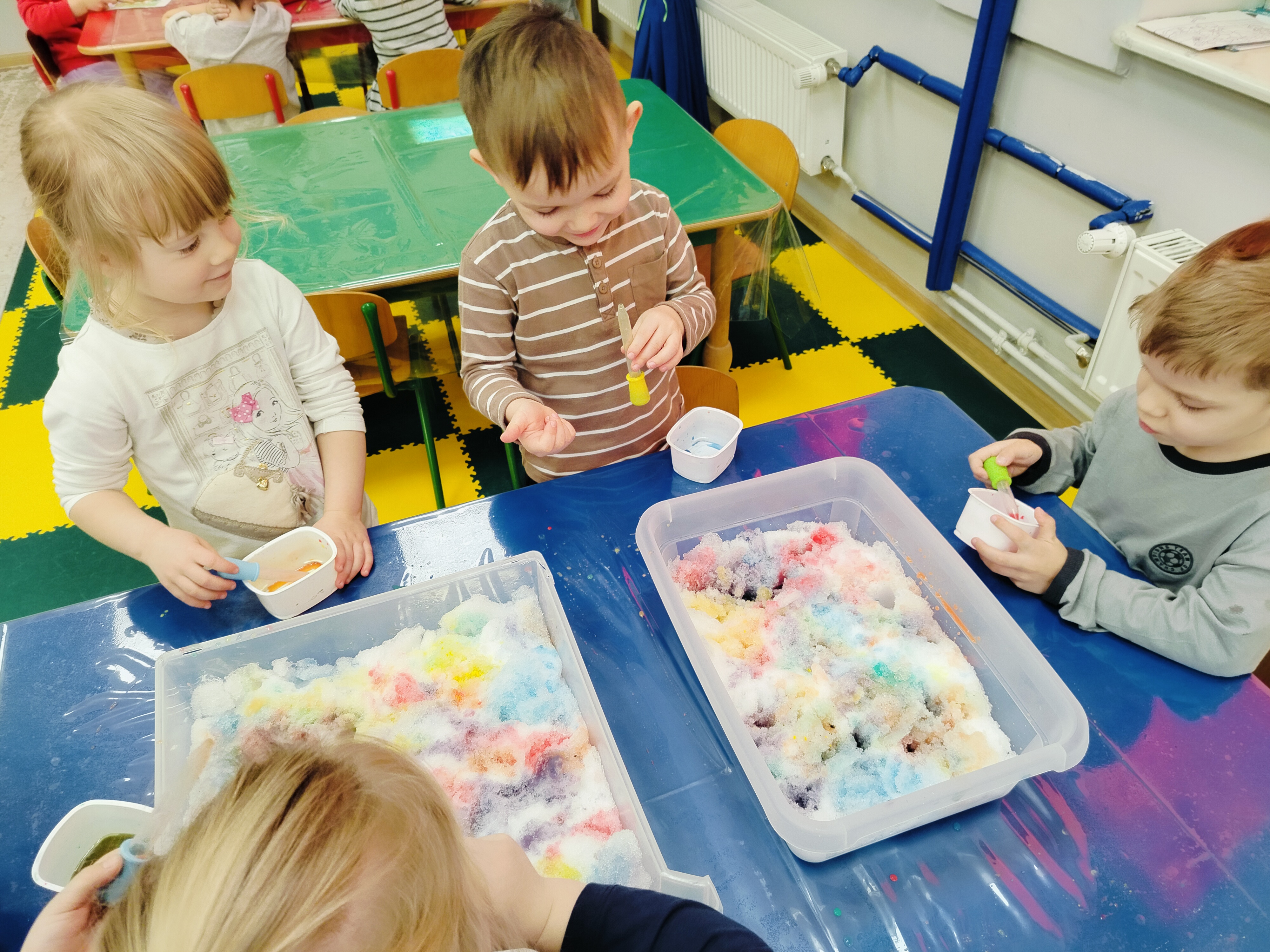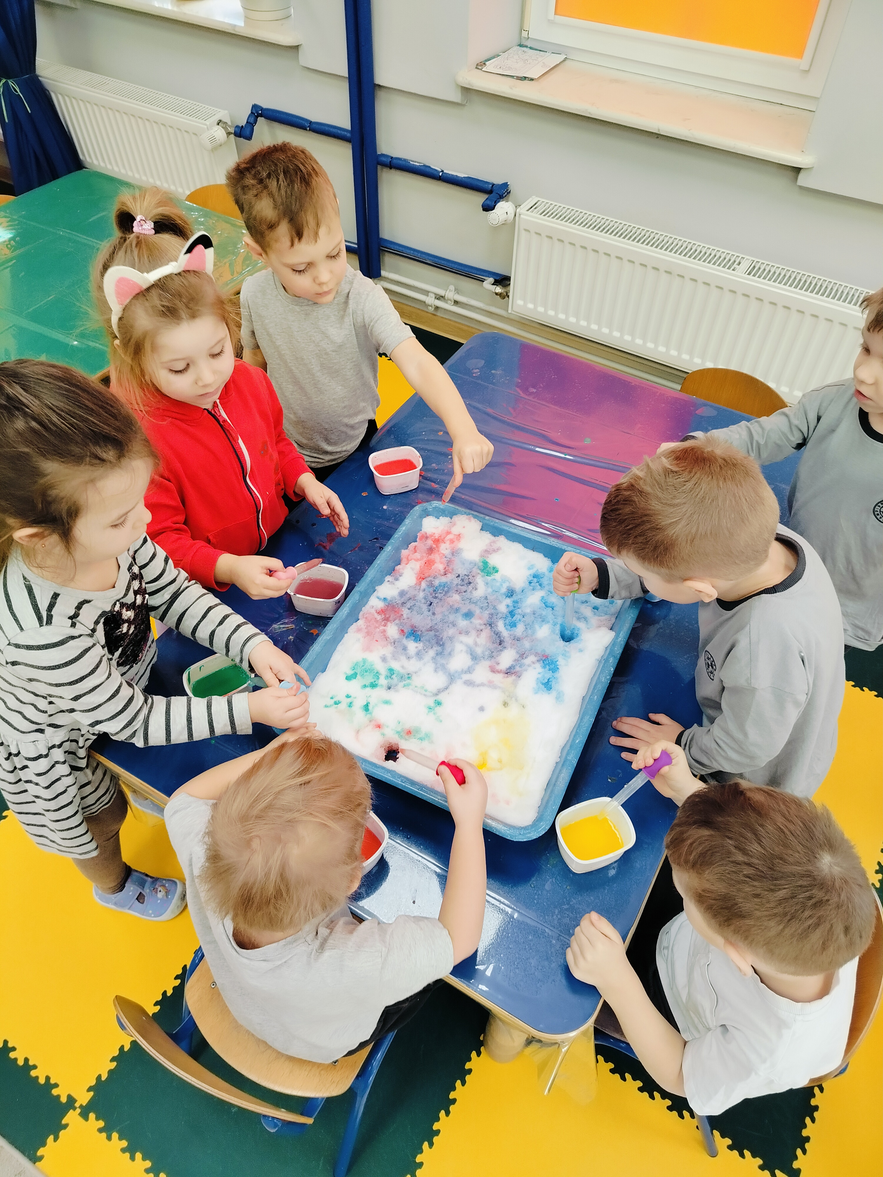 Dziś w naszym przedszkolu pudełko wypełnione śniegiem zamieniło się w prawdziwe płótno. Malowaliśmy po nim wodą z dodatkiem farb, obserwując jak kolory rozlewają się i tworzą niezwykłe wzory. To było nie tylko kreatywne, ale też bardzo ciekawe doświadczenie sensoryczne.